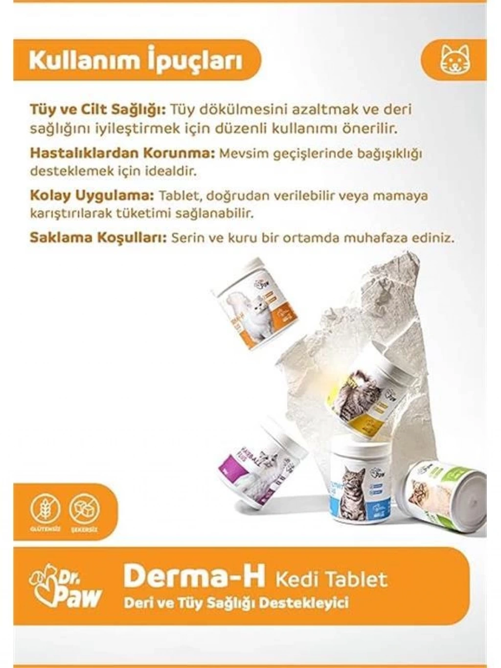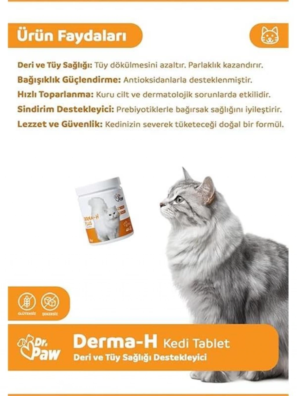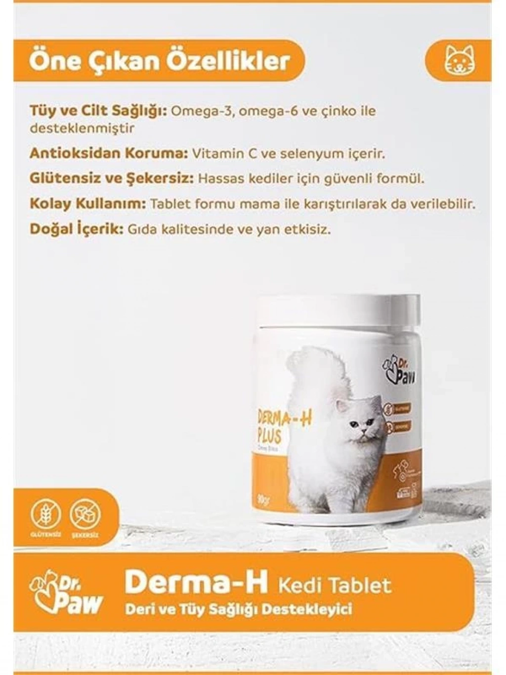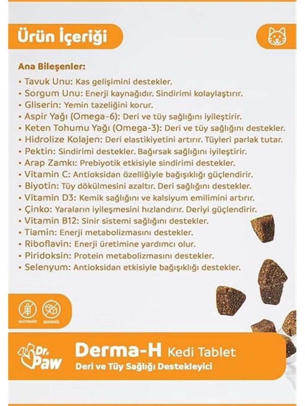 Bu ürün hakkında Tüy Dökülmesini Azaltır Cilt Sağlığını Korumaya Yardımcı Olur Antioksidan İçeren Besleyici Formül Cilt bariyerini güçlendirir Tüm Kediler İçin Uygun Çiğnenebilir tablet formundadır Mama ile karıştırılarak veya direkt verilebilir Kolay Kullanım Kediler severek tüketir Gıda sınıfı içerik Yan etkisi yok Gluten içermez Etkisi Düzenli Kullanımda 12 Hafta İçinde Gözlemlenir