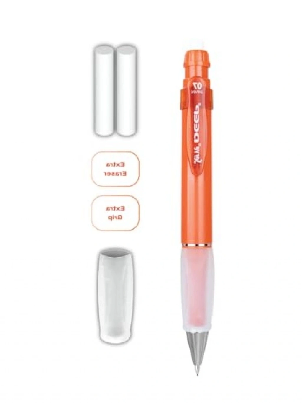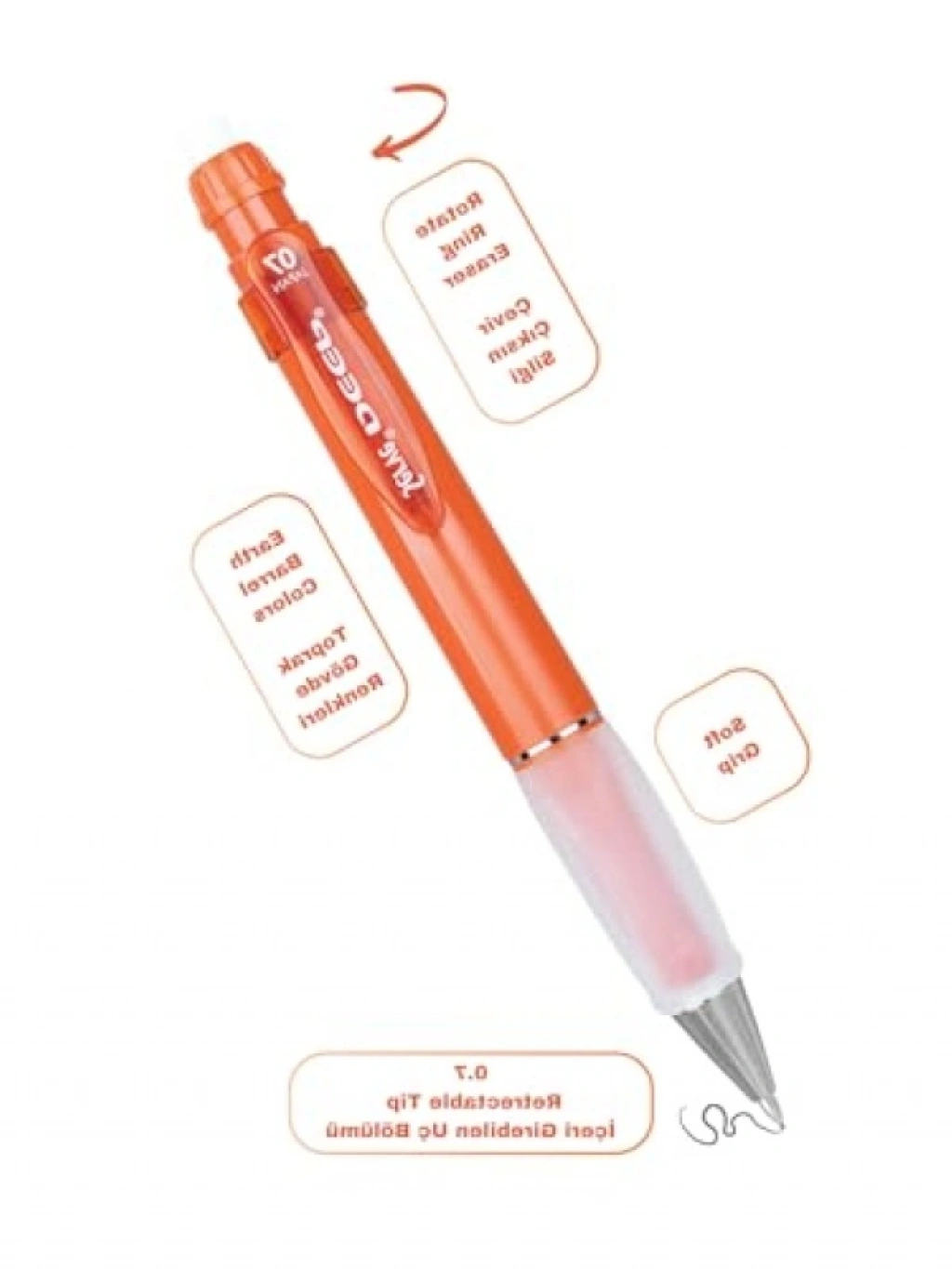 Bu set, gizlenebilir uç mekanizması ile güvenli kullanım sağlar. Ergonomik grip tasarımı, uzun süreli yazım işlemlerinde konfor sunar. Set içerisinde 2 adet yedek silgi ve 9 adet kalem gribi bulunmaktadır. 0,7 mm uç kalınlığı ile detaylı çizim ve yazım işlemleri için idealdir. Kiremit tonlarıyla estetik bir görünüm sunar.