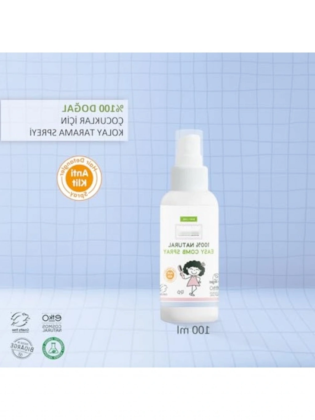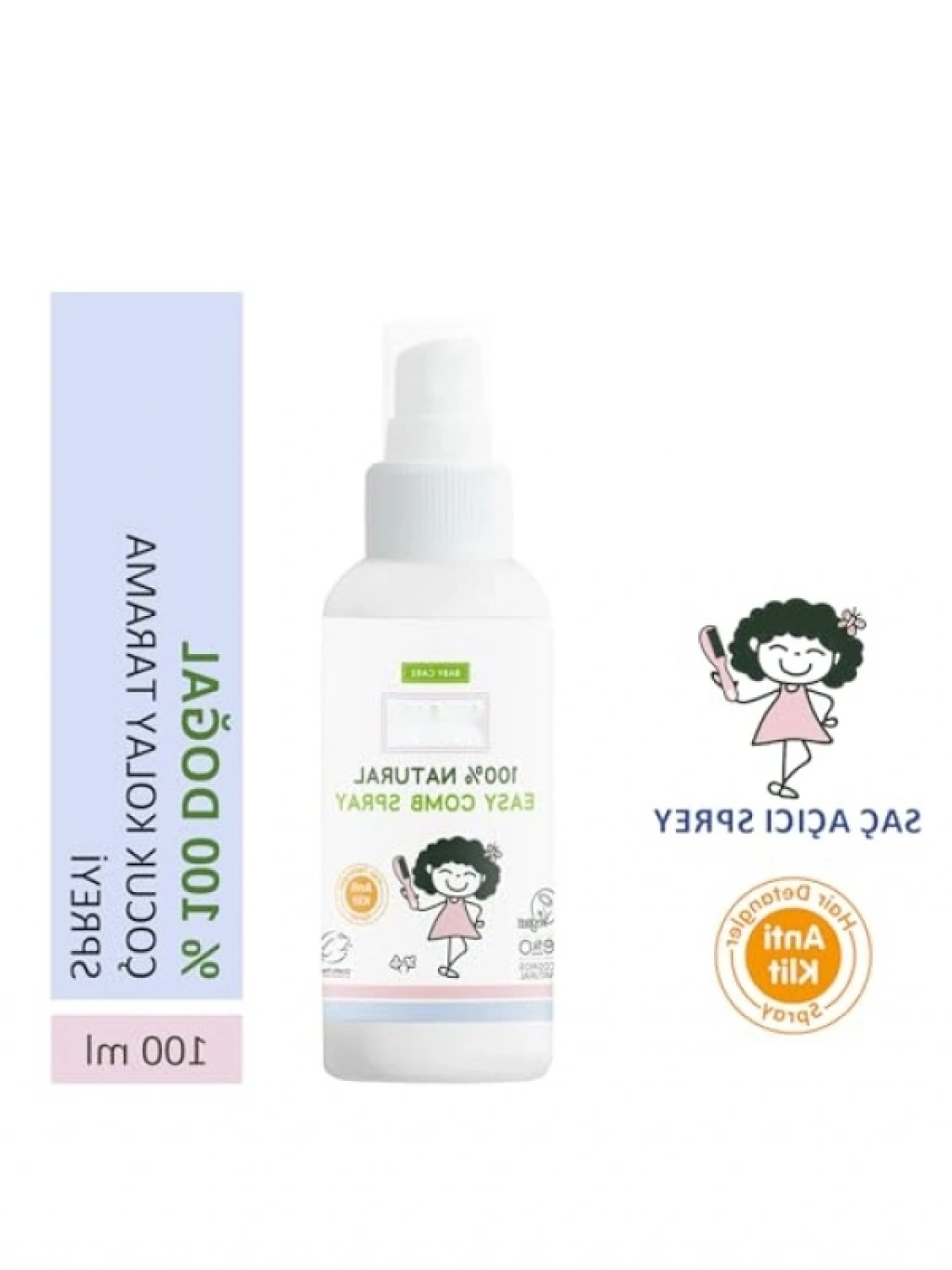 %100 doğal içeriklerle formüle edilmiş kolay tarama spreyi, çocukların saçlarını nemlendirir, elektriklenmeyi önler ve saç tellerinin rahatça ayrılmasını sağlar. Islak ve kuru saçlarda kullanılabilir, alkol ve boya içermez. Çocukların saç bakımında güvenli ve etkili bir çözümdür. Saçların sağlıklı ve parlak görünmesine yardımcı olur.