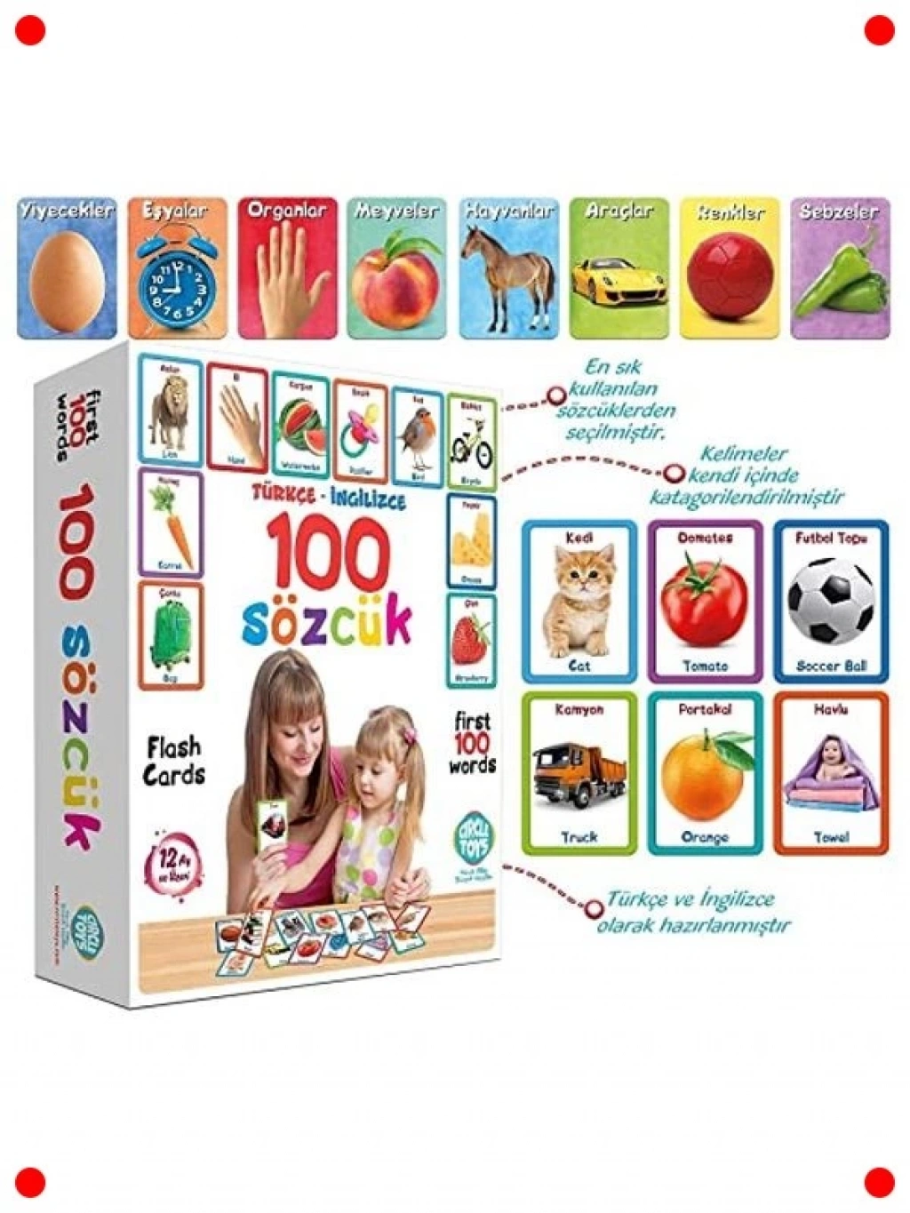 Miniklerin ilk kelimelerini keşfetmeleri için tasarlanmış bu 100 sözcük eğitici kart seti, görsel ve işitsel öğrenmeyi destekler. Canlı ve çekici görsellerle her bir kelimenin anlamını pekiştiren kartlar, çocukların kelime dağarcığını geliştirmelerine, nesneleri tanımalarına ve bilişsel becerilerini artırmalarına yardımcı olur. Dayanıklı karton malzemeden üretilmiştir ve küçük eller için ideal boyuttadır. Ebeveynlerin çocuklarıyla etkileşimli oyunlar oynaması, sorular sorması ve öğrenme sürecini eğlenceli hale getirmesi için harika bir araçtır. Erken çocukluk gelişimi için vazgeçilmez bir settir ve çocukların dünyaya dair bilgilerini genişletmelerine yardımcı olur.