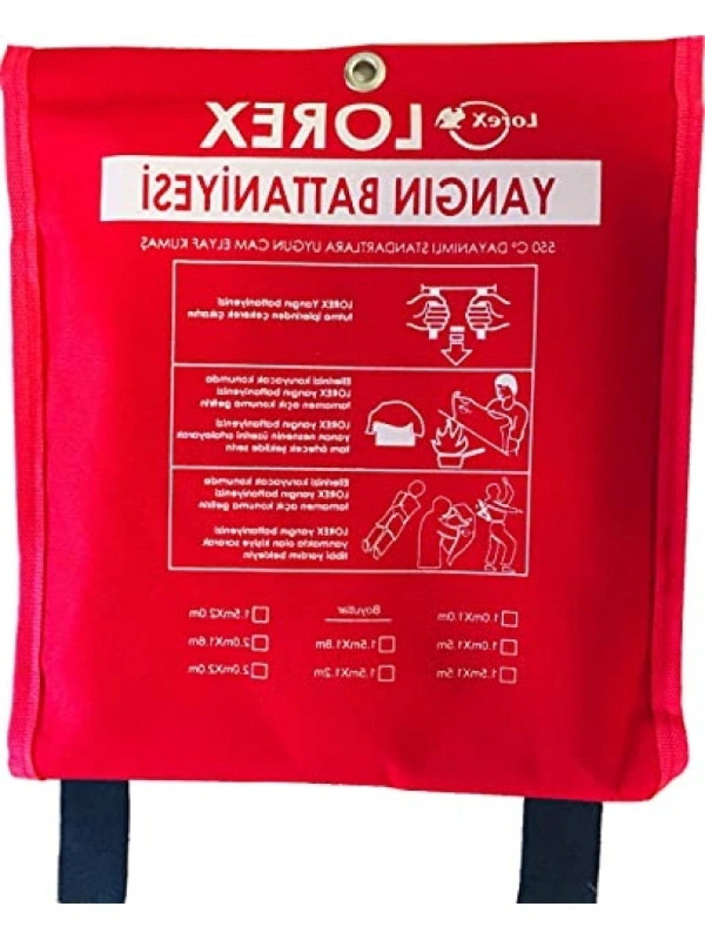 100 cm x 100 cm ölçülerindeki yangın söndürme battaniyesi, fiber glass yanmaz kumaştan üretilmiştir. Tutma bantları ile yangın yüzeyine kolayca örtülür. Üzerinde "YANGIN BATTANİYESİ" yazılı özel taşıma çantası ile birlikte sunulmaktadır. Saklama çantası üzerindeki askı deliği sayesinde evde ve dış mekanlarda kullanıma hazır halde bulundurabilirsiniz.