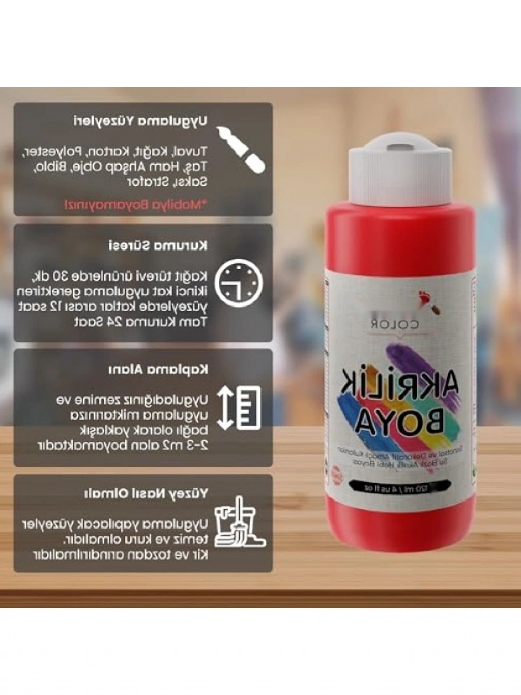 120 ml hacmindeki kırmızı akrilik boya, sanat çalışmalarınızda canlı renkler elde etmenizi sağlar. Hızla kuruyan yapısı, hem tuval hem de diğer yüzeylerde rahatlıkla kullanılabilir. Su bazlı formülü sayesinde temizliği kolaydır. Her türlü sanat projesi için ideal bir seçimdir. Profesyonel sanatçılar ve hobi amaçlı kullanıcılar için mükemmel bir yardımcıdır.