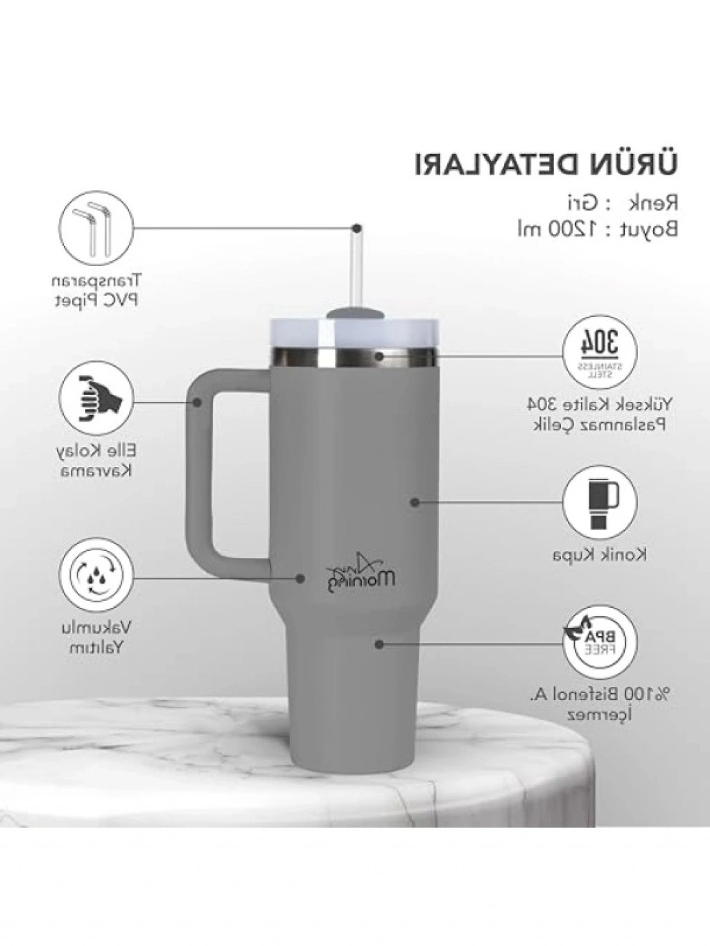 Geniş 1200 ml kapasitesiyle bu termos mug, uzun yolculuklar, ofis çalışmaları ve kamp etkinlikleri için idealdir. Çift katmanlı paslanmaz çelik gövdesi sayesinde içeceklerinizi 9 saate kadar sıcak, 12 saate kadar soğuk tutar. Sızdırmaz kapak tasarımı, hareket halindeyken güvenli kullanım sağlar. Üzerindeki üç aşamalı çevrilebilir mekanizma, termosu hem pipetli hem de pipetsiz kullanıma olanak tanır. Araç bardaklıklarıyla uyumlu olması seyahat sırasında rahatlıkla kullanım sağlar. Paslanmaz çelik yapısı, dört mevsim boyunca içeceklerinizi ideal sıcaklıkta muhafaza eder.