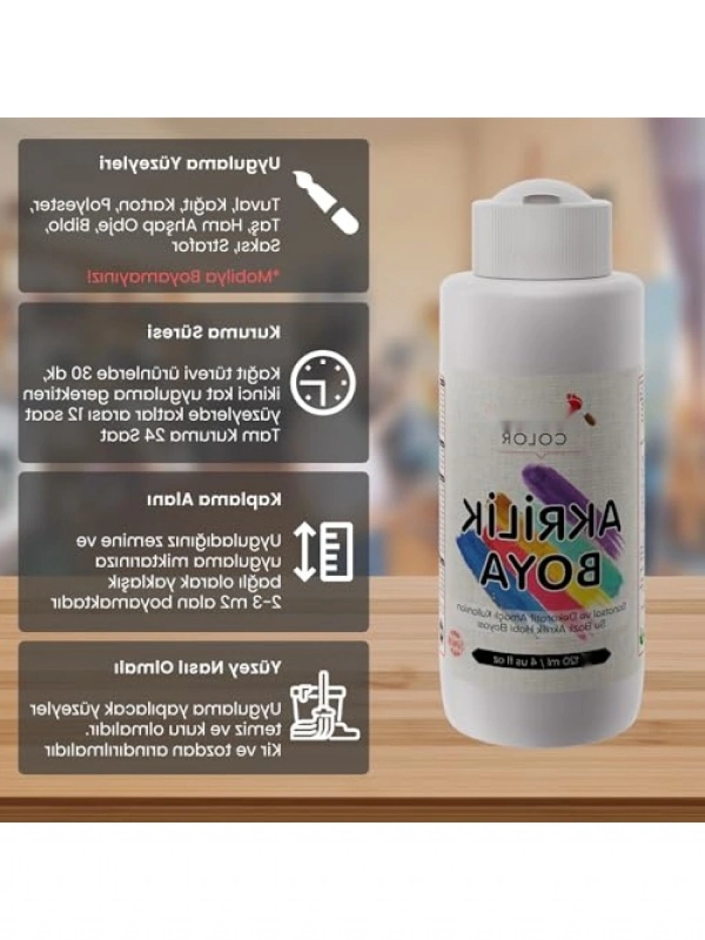 Yüksek kaliteli beyaz akrilik boya, 120ml boyutunda. Farklı yüzeylerde mükemmel sonuçlar için idealdir. Su bazlı yapısı sayesinde kolayca uygulanabilir ve hızla kurur. Sanat projelerinizde, el işlerinde veya tamirat işlerinizde kullanabileceğiniz pratik bir üründür. Renklerin canlılığını artırmak ve kalıcı bir sonuç elde etmek için tercih edebilirsiniz.