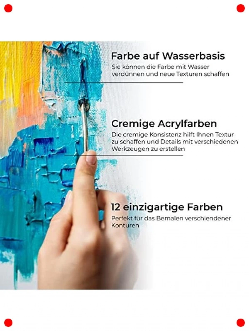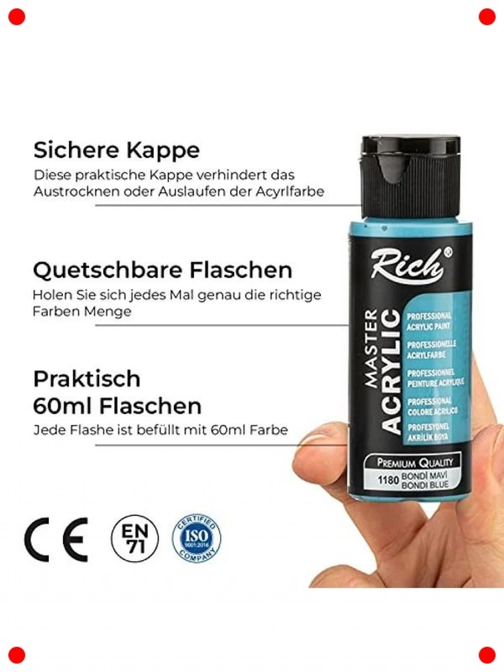 Sanatsal projeleriniz için 12 adet canlı renkten oluşan akrilik boya seti. Her şişede 60 cc boya bulunur, bu da uzun süreli kullanım için idealdir. Yüksek pigmentasyonlu formülü sayesinde canlı ve doygun renkler elde etmenizi sağlar. Tuval, ahşap, kağıt ve metal gibi birçok farklı yüzeyde kullanılabilir. Hızlı kuruma özelliğiyle katmanlı çalışmalar yapmaya uygundur. Hem profesyonel sanatçılar hem de hobi amaçlı kullanıcılar için mükemmeldir.