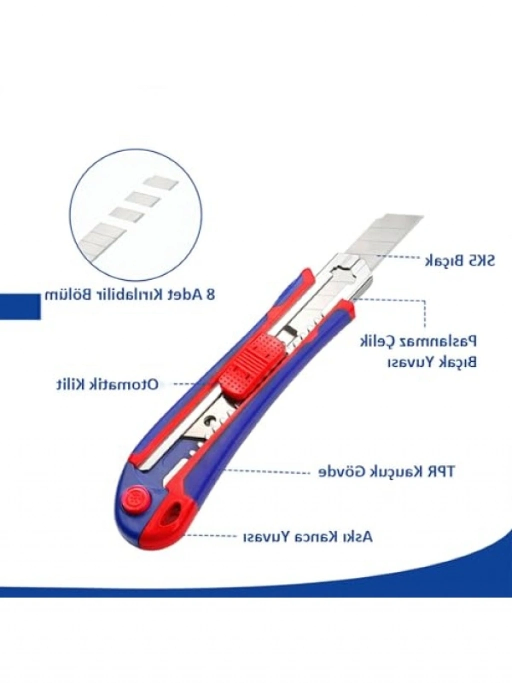 Ağır hizmet tipi dayanıklı paslanmaz çelik gövde ile tasarlanmış bu 18MM maket bıçağı, korozyona ve darbelere karşı yüksek koruma sunar. Kauçuk kaplama ABS plastik dış kasa, kullanım konforunu artırır. 7 parçalı kırılabilir trapezoid bıçaklar, halı, vinil, paspas, kâğıt, deri, kalın ip, mukavva, alçı panel levhalar, kontrplak ve koli gibi sert malzemelerin kesiminde mükemmel bir performans sağlar. SK5 karbon çelikten üretilmiş bıçaklar, yüksek keskinlik sunarak kesim işlerinizi kolaylaştırır. Universal 18MM maket bıçakları ile uyumlu yapısı sayesinde her türlü projede güvenle kullanabilirsiniz.