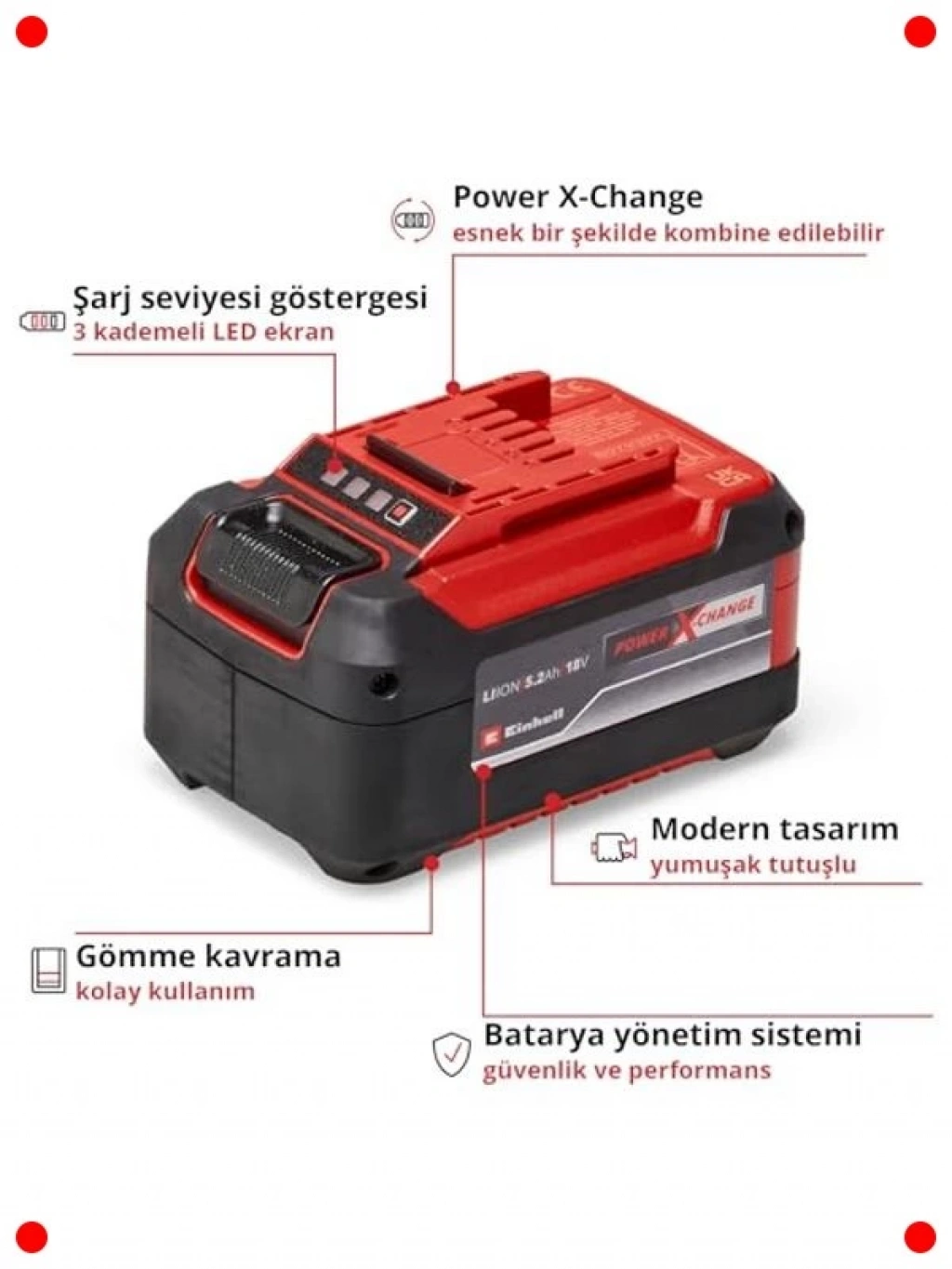 Kablosuz el aletlerinizin performansını artırmak ve çalışma sürenizi uzatmak için tasarlanmış bu 18V 5.2 Ah yüksek performanslı yedek akü ile güce kesintisiz devam edin. Gelişmiş lityum-iyon teknolojisi sayesinde, uzun ömürlü kullanım ve yüksek enerji yoğunluğu sunar. Hızlı şarj özelliği ile kısa sürede tekrar kullanıma hazır hale gelirken, hafıza etkisi olmaması sayesinde her zaman tam kapasiteyle çalışır. Darbe ve aşırı ısınmaya karşı koruma sağlayan sağlam yapısıyla, zorlu çalışma koşullarında bile güvenilir performans sunar. Tüm uyumlu 18V kablosuz aletlerinizle mükemmel bir şekilde eşleşir.