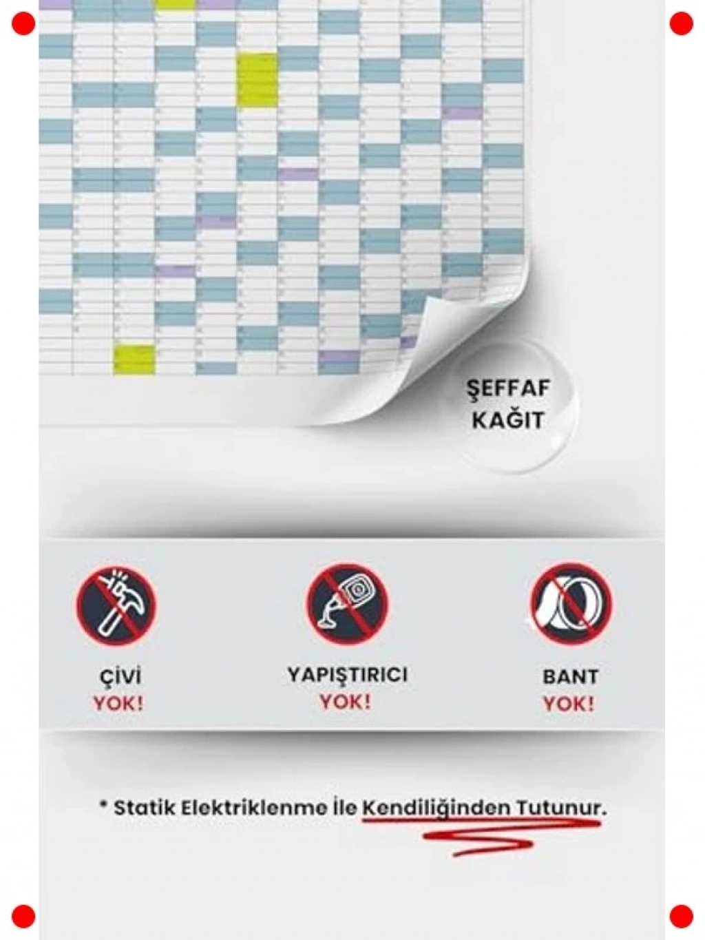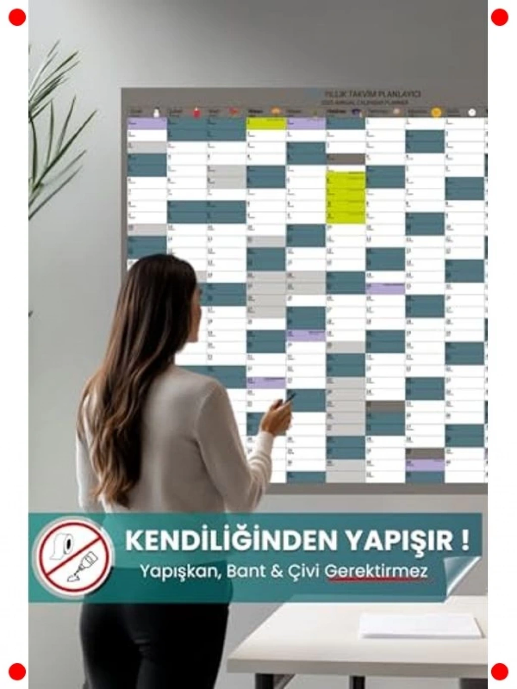 2025 yılı için özel olarak tasarlanmış bu şeffaf ve elektrostatik yıllık planlayıcı, yenilikçi yapışkansız özelliği sayesinde duvarlara, camlara veya düz yüzeylere kendiliğinden tutunur. Defalarca yapıştırılıp çıkarılabilir, hiçbir iz bırakmaz ve yüzeylere zarar vermez. Büyük boyutu (100 cm x 120 cm) ile tüm yılınızı tek bir bakışta görmenizi sağlar. Toplantıları, randevuları ve önemli etkinlikleri kolayca işaretleyebilir, silinebilir kalemlerle düzenlemeler yapabilirsiniz. Ofiste, okulda veya evde proje yönetimi ve genel planlama için pratik ve çevre dostu bir çözümdür.