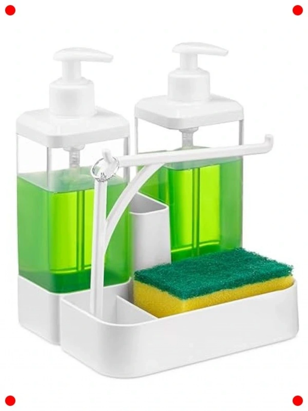 Banyo ve mutfaınız için ideal olan bu ikili sıvı sabunk seti ile tezgah üstü düzeninizi sağlayın ve hijyeninizi artırın. İki adet 350 ml kapasiteli sabunk haznesi, farklı sıvı sabunları veya şampuanları saklamak için mükemmeldir. Setin en büyük antajı, entegre sünger haznesi ve bez askısıdır; böylece tezlik malzemeleriniz her zaman elinizin altında or ve düzenli bir görünüm sağlanır. Modern ve şık tasarımıyla her banyo veya mutfak dekorasyonuna uyum sağlar. Kolay doldurulabilir yapısı ve dayanıklı malzemesi, uzun ömürlü bir kullanım sunar. Fonksiyonel ve estetik bu set, günlük kullanımınızı pratikleştirirken yaşam alanlarınıza şıklık kcak.