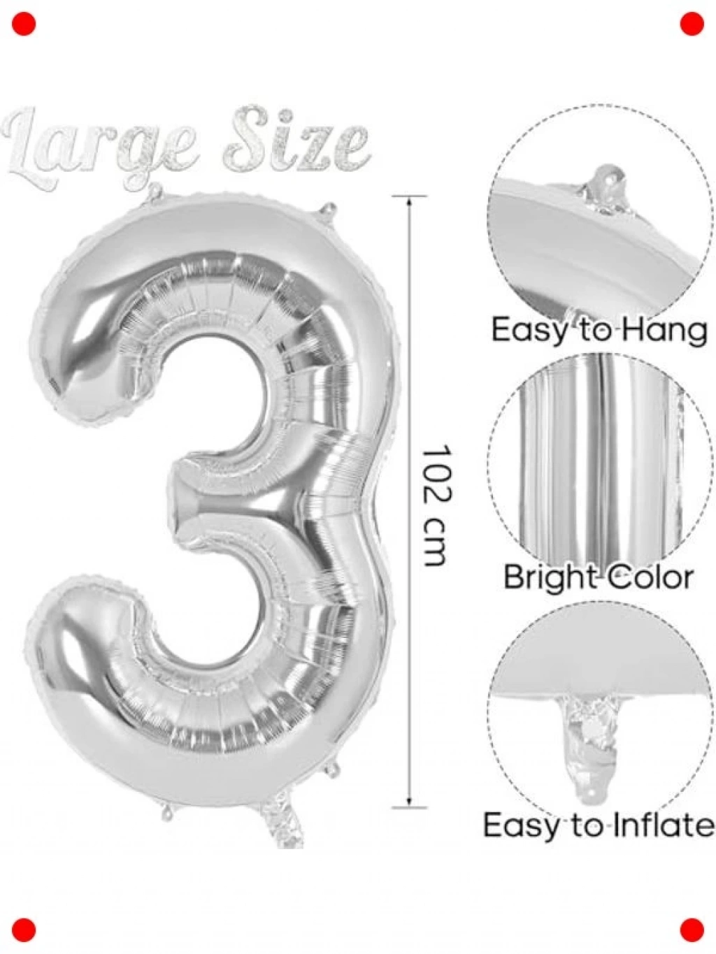 Özel günlerinize ışıltı katacak bu büyük boy gümüş renkli 3 rakamı folyo balon ile kutlamalarınızı unutulmaz kılın. 102 cm boyutuyla her ortamda dikkat çeken bu uçan balon, doğum günü partileri, yıl dönümleri ve diğer özel etkinlikler için ideal bir dekorasyon öğesidir. Kolayca helyum veya hava ile şişirilebilir ve uzun süre havada kalır. Etkileyici fotoğraf çekimleri için harika bir arka plan oluştururken, sevdiklerinizin yaşını veya özel anınızı eğlenceli bir şekilde vurgulamanızı sağlar. Parti atmosferinizi anında yükseltin!
