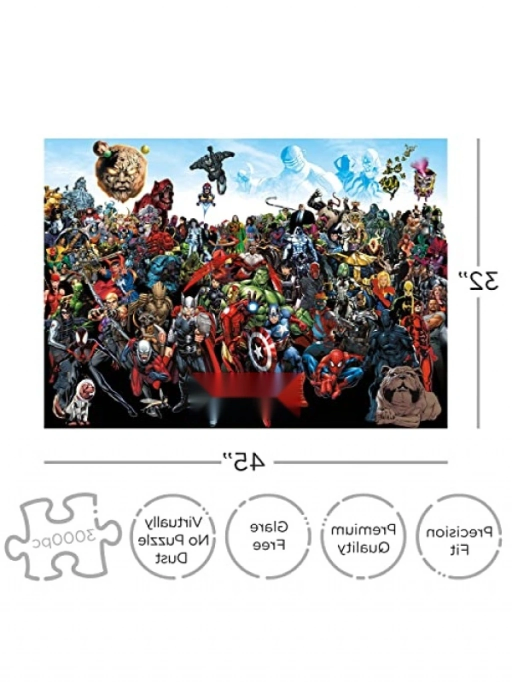 Marvel evreninde yer alan en büyük süper kahramanlarla dolu bu 3000 parçalık bulmaca, heyecan dolu bir deneyim sunuyor. Örümcek Adam, Hulk, Thor, Demir Adam gibi ikonik karakterleri bir araya getiren bu bulmaca, ailece eğlenceli vakit geçirmenin harika bir yoludur. Hassas kesim tekniği ile üretilen bulmaca parçaları, mükemmel uyum sağlamaktadır. Yansıma yapmayan kalın kaliteli kağıt kullanılarak üretilmiş olması, bulmacanızı gururla sergilemenizi sağlar.