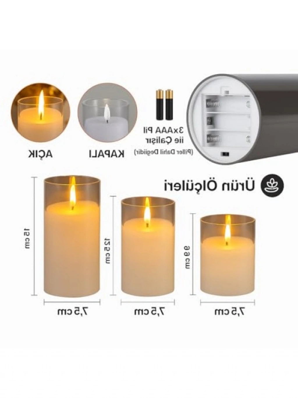 Bu 3'lü LED mum seti, sıcak ve yumuşak 3200K ışık tonu ile gerçek alev hissi yaratır. Şık cam tasarımı, her ortama uyum sağlar ve dekoratif kullanım için idealdir. Pilli çalışması sayesinde kablo derdi olmadan her yerde kullanılabilir. Alev ve sıcaklık içermediği için çocuklar ve evcil hayvanlar için güvenlidir. Uzun ömürlü LED teknolojisi ile düşük enerji tüketimi sağlar.