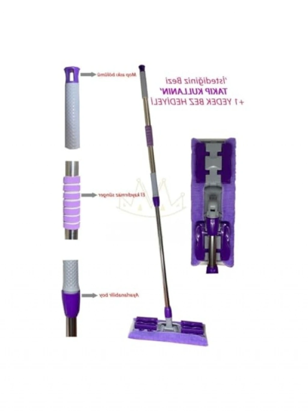 Bu pratik mop, 360 derece dönebilme özelliği ile her türlü yüzeyde etkili temizlik sağlar. Teleskopik sapı sayesinde boyutunu kolayca ayarlayıp, farklı alanlarda kullanabilirsiniz. Hediye yedek bez ile birlikte gelir ve çamaşır makinesinde yıkanabilir. Yer, duvar, fayans gibi çok çeşitli yüzeylerde rahatlıkla kullanılabilir.