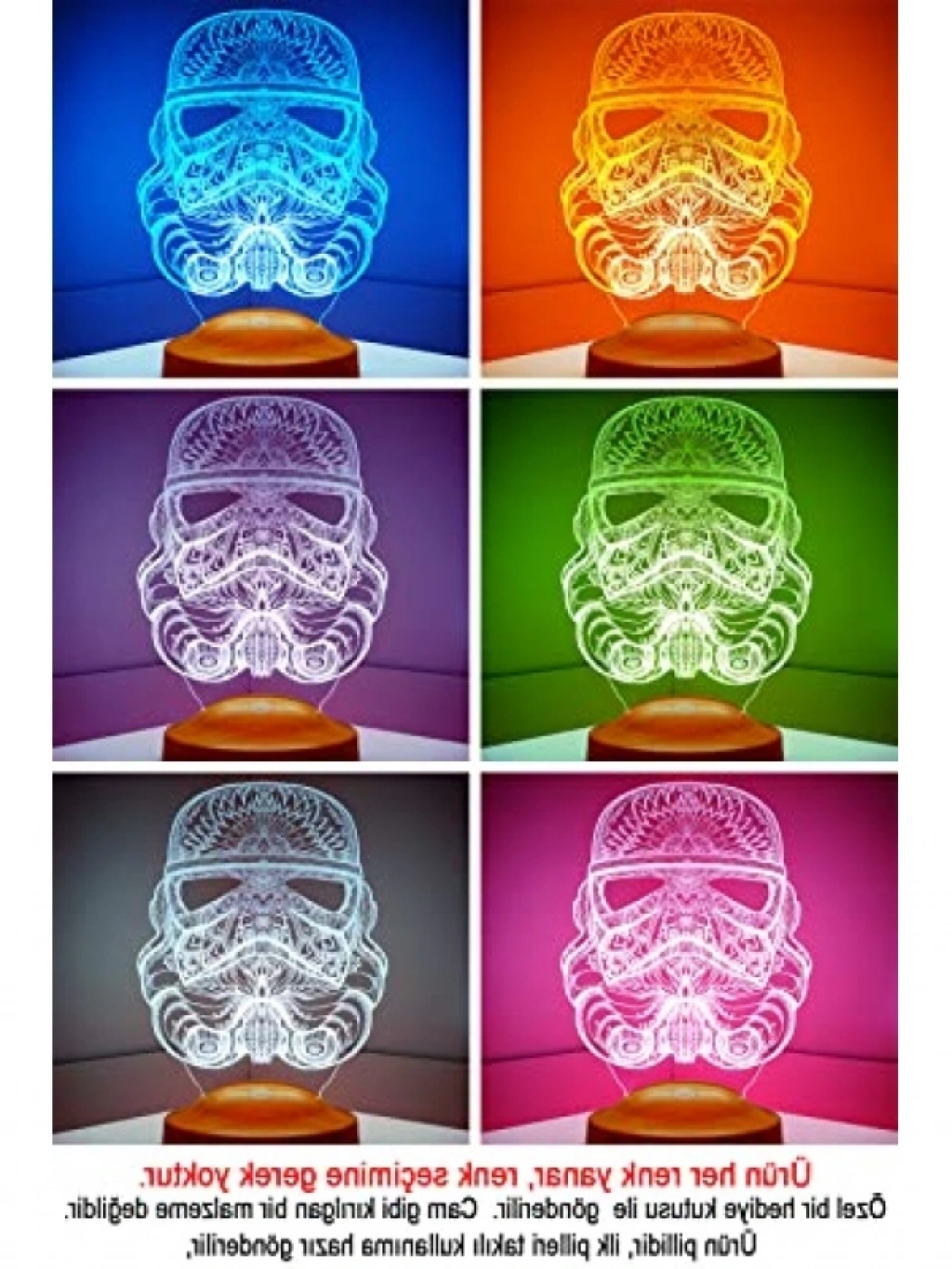 3D Stormtrooper tasarımıyla dikkat çeken bu 3 boyutlu LED lamba, 7 farklı renk seçeneği ile kullanıcılara sunulmaktadır. Renk değiştirme özelliği sayesinde istediğiniz renk tonunu seçebilir, çift tıklayarak RGB modunu etkinleştirerek otomatik geçiş yapabilirsiniz. Taşınabilir yapısı ve şık tasarımıyla hem dekoratif hem de işlevsel bir aydınlatma seçeneğidir.