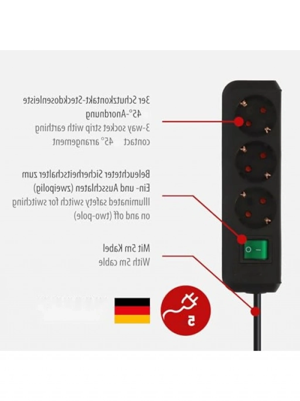 Bu 3'lü topraklı priz, 5 m kablo uzunluğu ile geniş bir hareket alanı sunar. Yüksek temas korumalı yapısı ile güvenli bir kullanım sağlar. Işıklı emniyet şalteri sayesinde prizinizi kolayca açıp kapatabilirsiniz. 45° açılı fişler için uygundur, böylece prizinizi istediğiniz gibi yerleştirebilirsiniz.