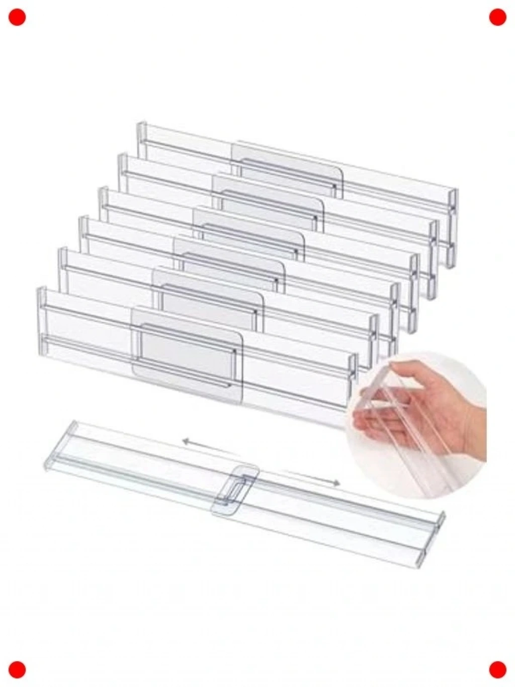 Çekmecelerinizdeki karmaşaya son vermek için tasarlanmış bu 3'lü şeffaf akrilik çekmece bölücü seti ile tanışın. Teleskopik yapısı sayesinde çekmecenizin genişliğine göre kolayca ayarlanabilir, böylece mutfak, banyo, ofis veya yk odası çekmecelerinde mükemmel uyum sağlar. İç çamaşırından çl bıçağa, makyaj malzemesinden ofis gereçlerine kr her türlü eşyayı düzenli bir şekilde ayırmanıza yardımcı or. Şeffaf akrilik malzemesi, hem şık bir görünüm sunar hem de eşyalarınızı kolayca bulmanızı sağlar. Kurumu basit ve kullanışlı olan bu set, hayatınızı kolaylaştıran pratik bir çözümdür.