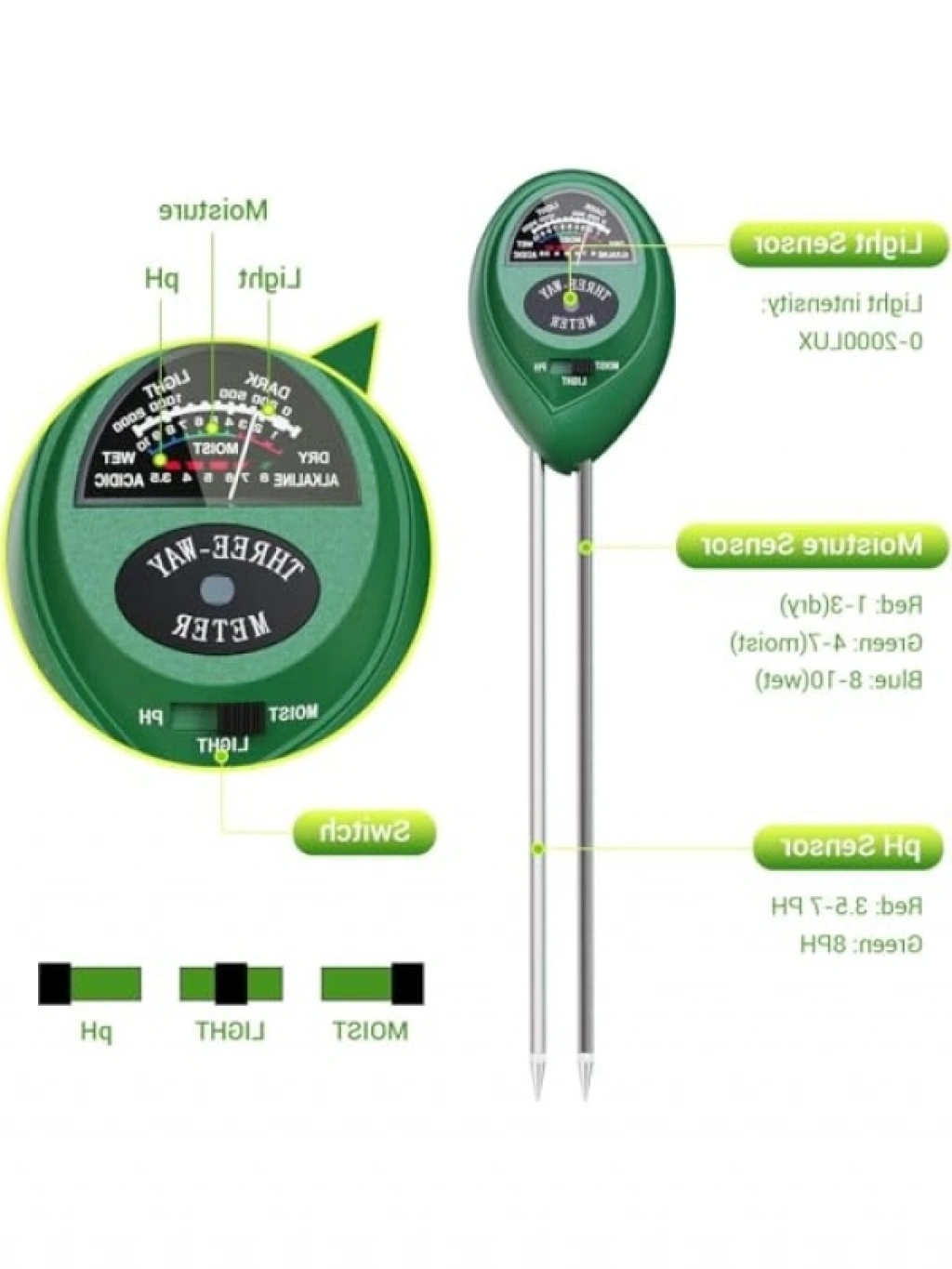 Bitkilerinizin sağlığını kontrol etmek için tasarlanmış bu 3'ü bir arada ölçer, toprak nemini, pH seviyesini ve ışık miktarını ölçer. Kullanımı oldukça basit olan bu cihaz, pile ihtiyaç duymadan sadece toprağa saplanarak kullanılabilir. Bitkilerinizin ihtiyaçlarını belirlemek ve sağlıklı bir şekilde büyümelerini sağlamak için mükemmel bir yardımcıdır.