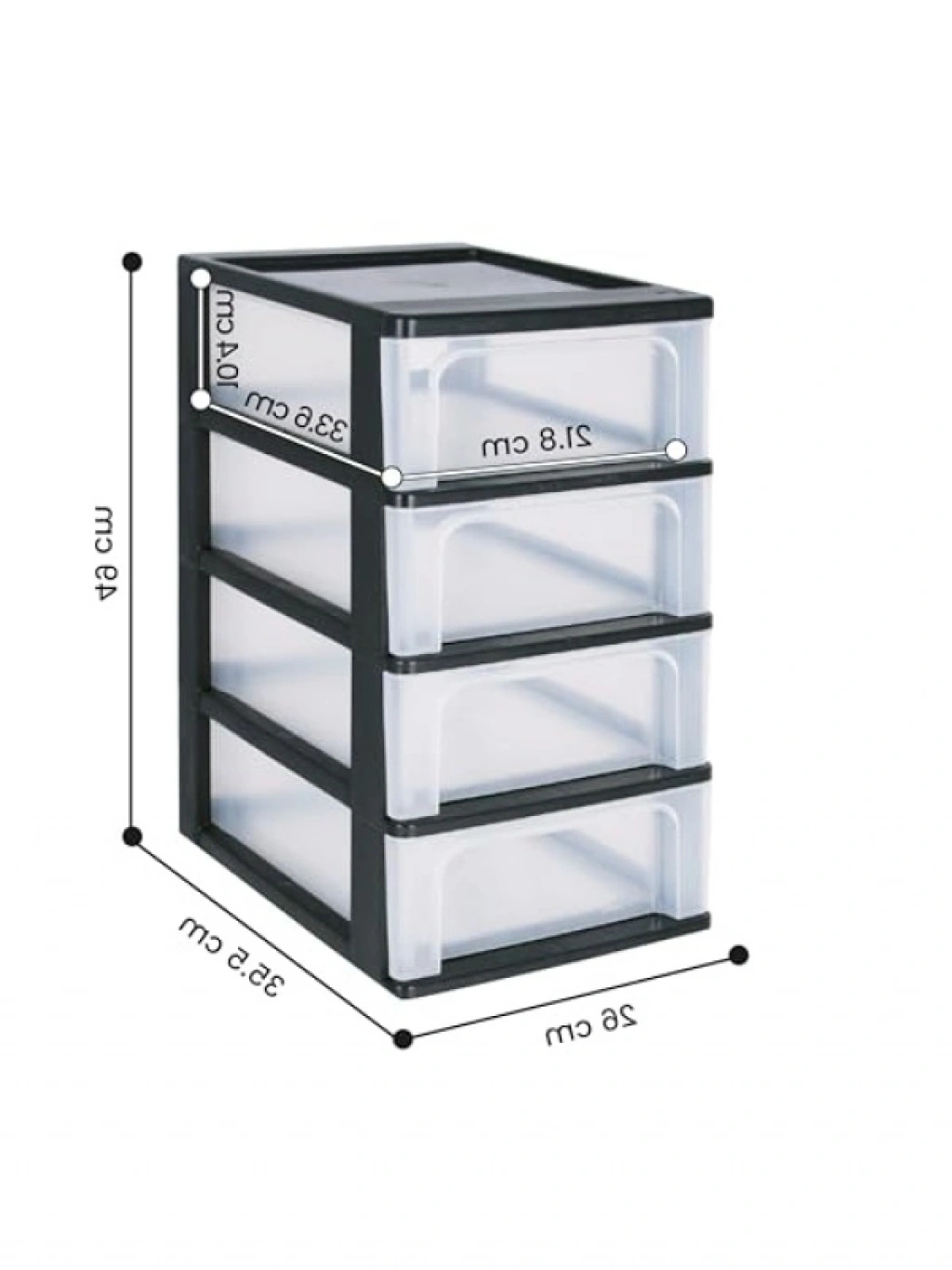 Bu şeffaf plastik dolap, 4 adet çekmeceden oluşmaktadır ve toplamda 7 litre kapasiteli bir depolama çözümü sunar. A4 boyutundaki ofis malzemelerinizi düzenli bir şekilde saklamak için idealdir. Çekmece stoperi, çekmecelerin düşmesini engelleyerek güvenli bir kullanım sağlar. Modern tasarımı ile her çalışma alanına uyum sağlar.