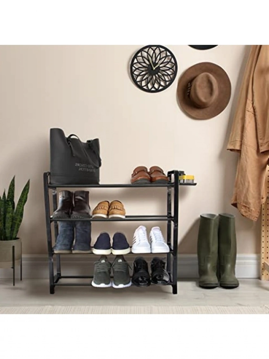 Bu 4 katlı ayakkabılık, hem dekoratif hem de işlevsel bir çözümdür. İç kısmı güçlendirilmiş plastik çubuklarla desteklenmiştir ve her kata 3 çift ayakkabı veya terlik sığacak şekilde tasarlanmıştır. İhtiyacınıza yönelik olarak kat sayısını ayarlayabilirsiniz. Bot ve geniş tabanlı ayakkabılar için de alan sunar. Ayrıca, gündelik eşyalarınızı koymak için ek bir haznesi bulunmaktadır. Dayanıklı yapısı ile uzun süre kullanım sağlar; evinizde düzeni sağlayarak hayatınızı kolaylaştırır.