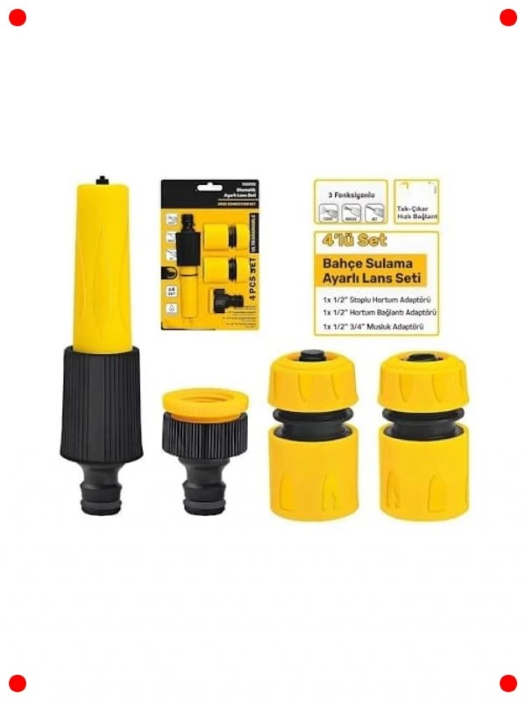 Bahçe sulama işlerinizi kolaylaştıracak eksiksiz 4 parçalı otomatik ayarlı sulama seti. Bu set, ayarlı bir lans, çeşitli hortum bağlantı aparatları ve gerekli aksesuarları içerir. Kolay kurulumu sayesinde bahçenizde anında kullanıma başlayabilirsiniz. Farklı püskürtme modları sayesinde çiçeklerinizi, sebzelerinizi veya çim alanlarınızı ihtiyaçlarına göre sulayabilirsiniz. Otomatik ayar özelliği, su basıncını optimize ederek su tasarrufu yapmanıza yardımcı olur. Dayanıklı malzemelerden üretilmiş olup uzun ömürlü kullanım sunar. Bahçenizin her köşesine suyu verimli bir şekilde ulaştırın.