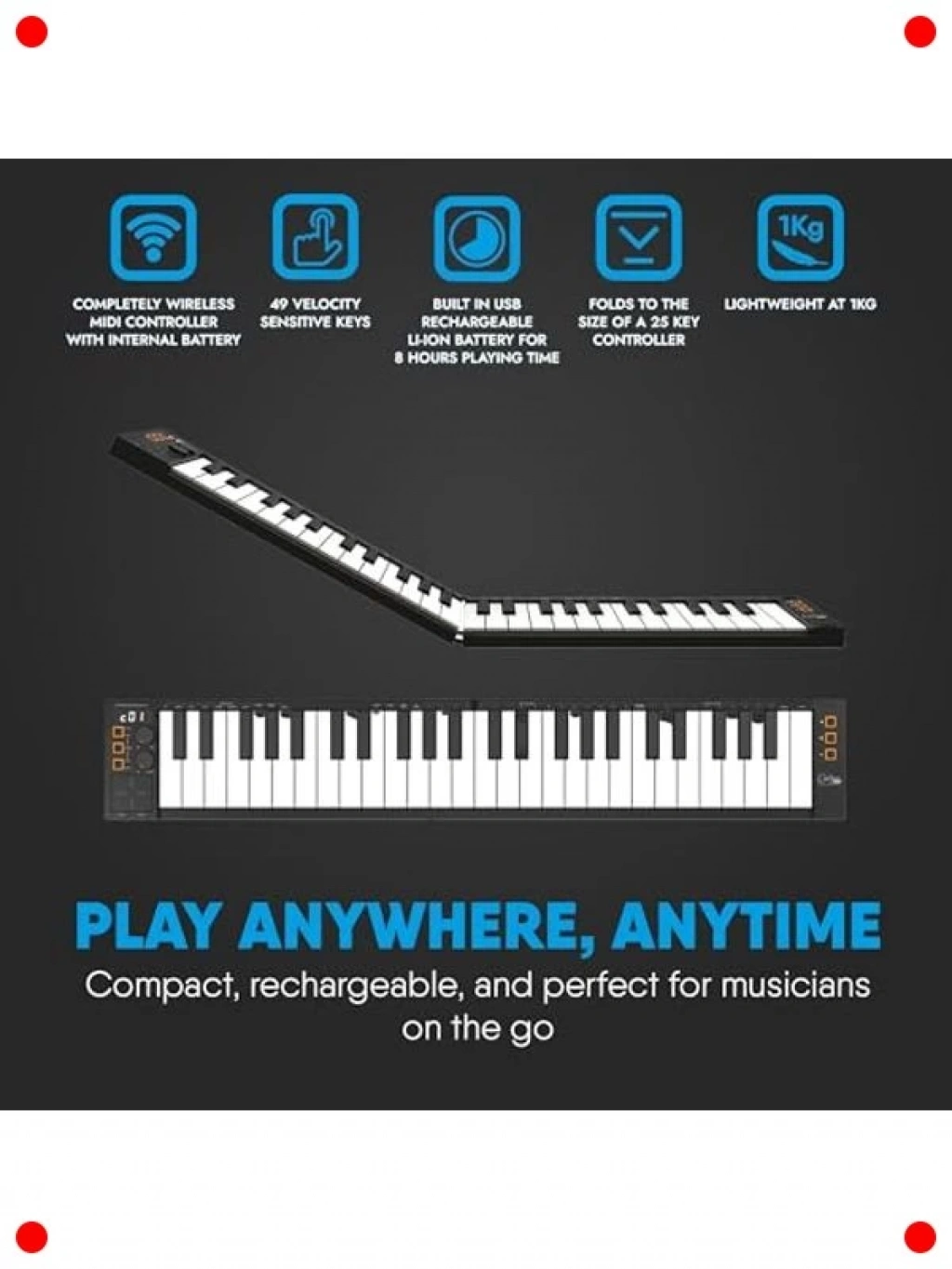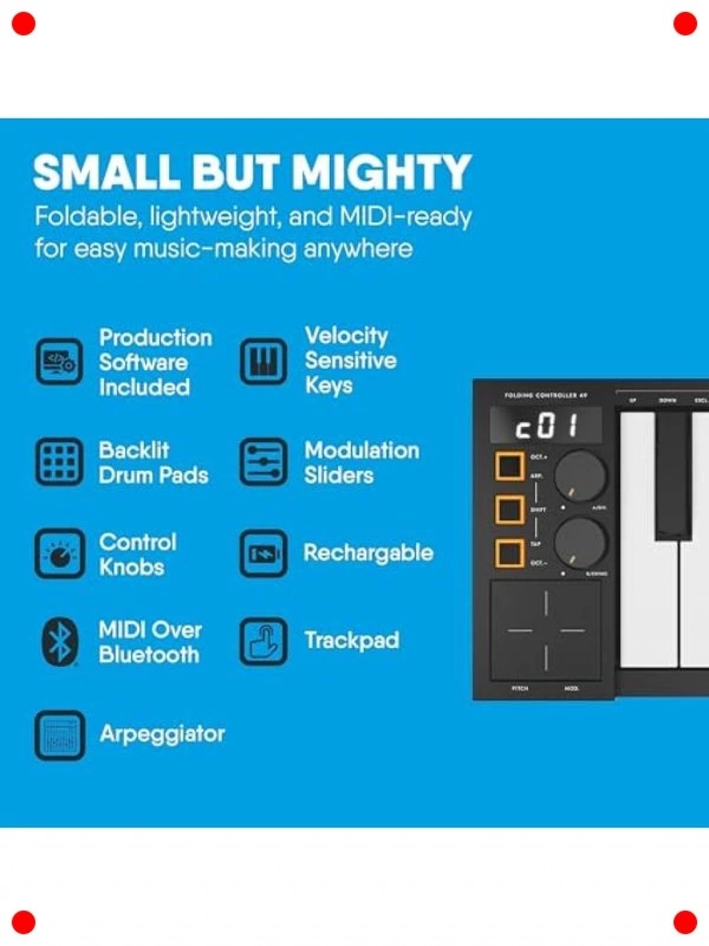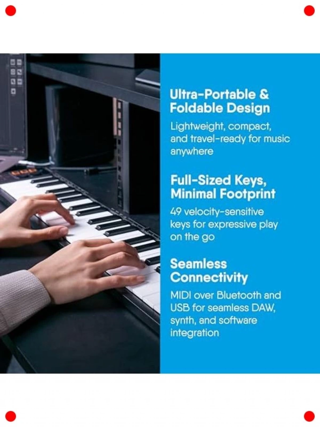 Müzisyenlerin her yerde müzik yapabilmesi için tasarlanmış, 49 tuşlu, katlanabilir ve taşınabilir MIDI klavye. Tam boyutlu tuşları sayesinde gerçekçi bir çalma deneyimi sunarken, katlanabilir yapısı sayesinde kolayca taşınabilir ve depolanabilir. Siyah rengiyle şık bir görünüme sahiptir. USB bağlantısı ile bilgisayarınıza veya mobil cihazlarınıza kolayca bağlanır, böylece favori DAW'ınızla veya müzik uygulamalarınızla sorunsuz bir şekilde entegre olur. Hafif ve kompakt yapısı, ev stüdyosundan canlı performansa, seyahatlerden açık hava etkinliklerine kadar her ortamda yaratıcılığınızı serbest bırakmanızı sağlar.
