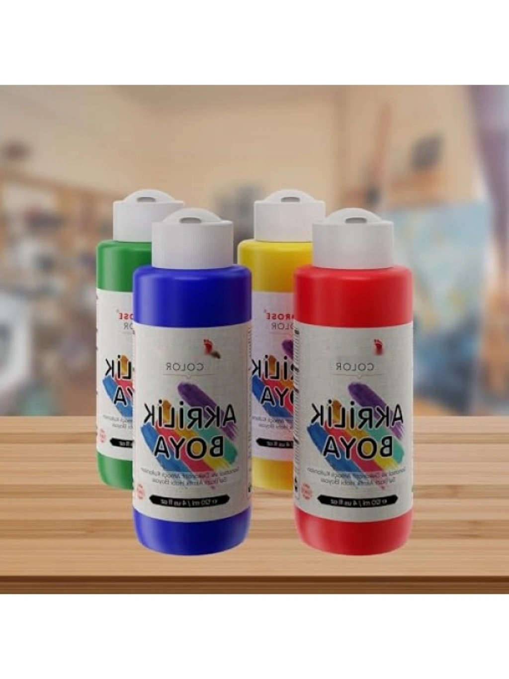 Bu 4'lü ana renk akrilik boya seti, 120 ml'lik şişelerde sunulmaktadır ve sanatsal çalışmalarınızda ihtiyacınız olan temel renkleri içerir. Renkler yüksek kalitede pigmentler ile zenginleştirilmiştir, bu da canlı ve kalıcı sonuçlar elde etmenizi sağlar. Akrilik boya, hızlı kuruma özelliği ile farklı yüzeylerde rahatlıkla kullanılabilir. Hem profesyonel sanatçılar hem de hobi amaçlı kullanıcılar için mükemmel bir seçimdir.