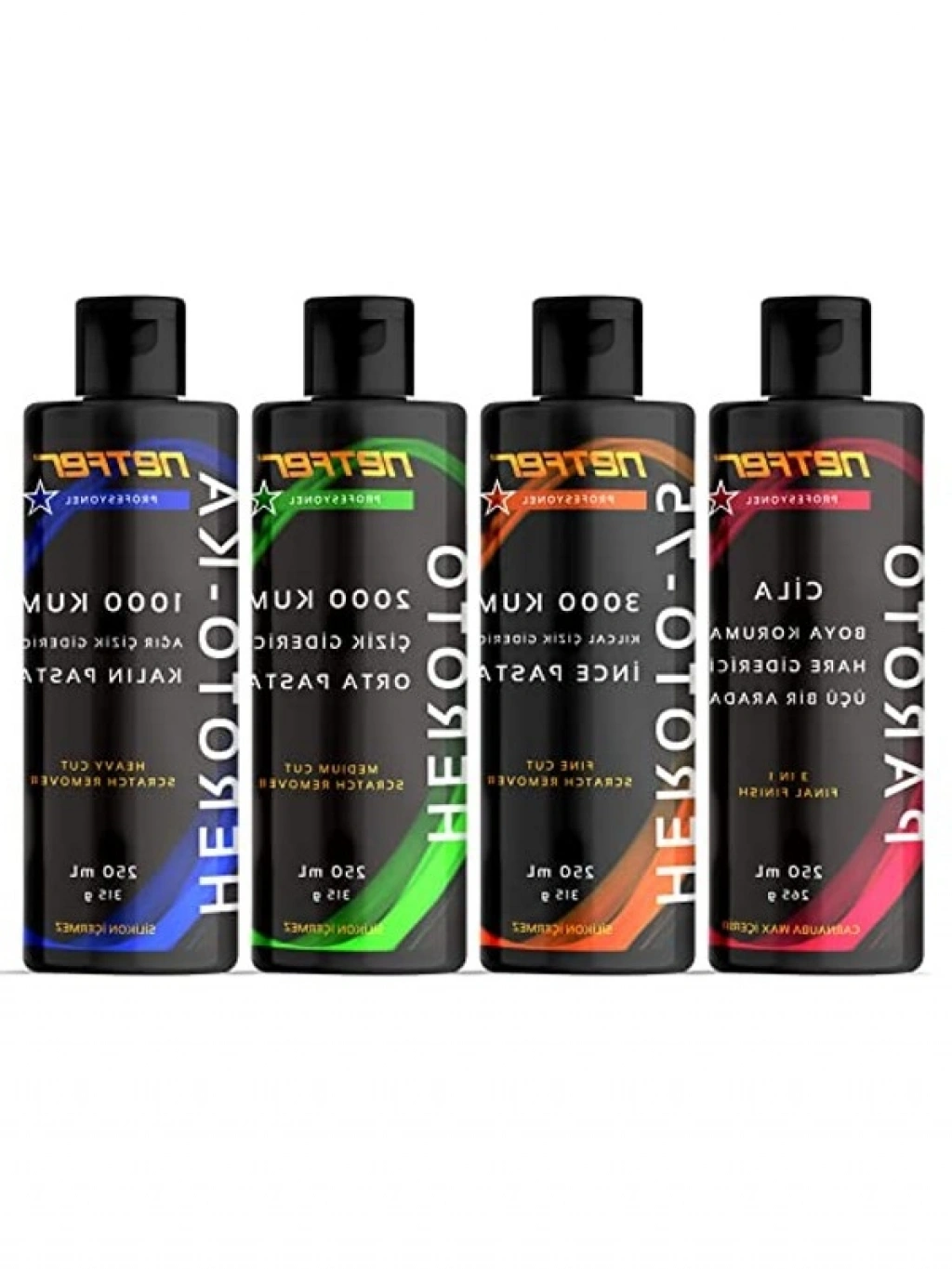 Bu 4'lü pasta cila seti, her biri 250 mL hacminde dört farklı cila içermektedir. Araç yüzeylerini parlak ve korunaklı hale getirmek için tasarlanmış bu ürünler, kolay kullanım sunar ve etkili sonuçlar elde etmenizi sağlar. Cila seti, aracınızın boya yüzeyini korurken aynı zamanda estetik bir görünüm kazandırır. Her bir ürün, özel formülasyonları sayesinde toz, kir ve su lekelerine karşı dayanıklıdır.