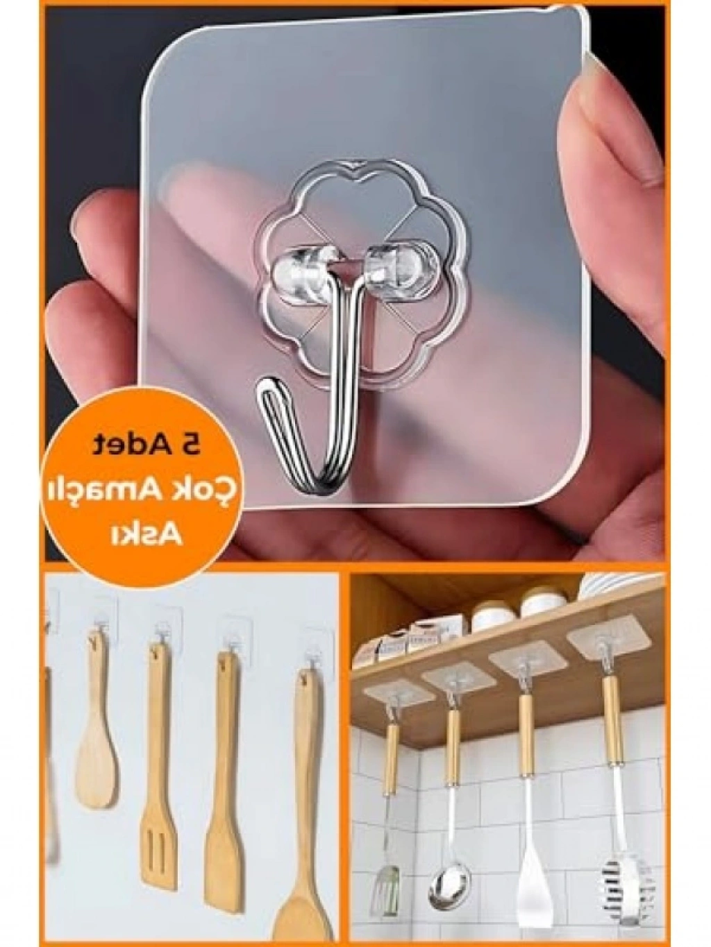 Bu set, 5 adet güçlü şeffaf duvar askısından oluşmaktadır. Yapışkan vantuzları sayesinde çeşitli yüzeylere kolayca yapıştırılabilir, mutfak veya banyo gibi alanlarda rahatlıkla kullanılabilir. Dayanıklı yapısı ile uzun süreli kullanım sunar. Eşyalarınızı düzenli bir şekilde saklamak için mükemmel bir çözümdür. Ergonomik tasarımı sayesinde kullanım kolaylığı sağlar.