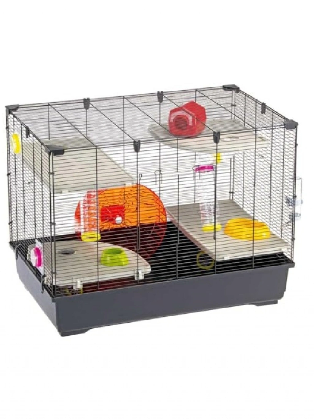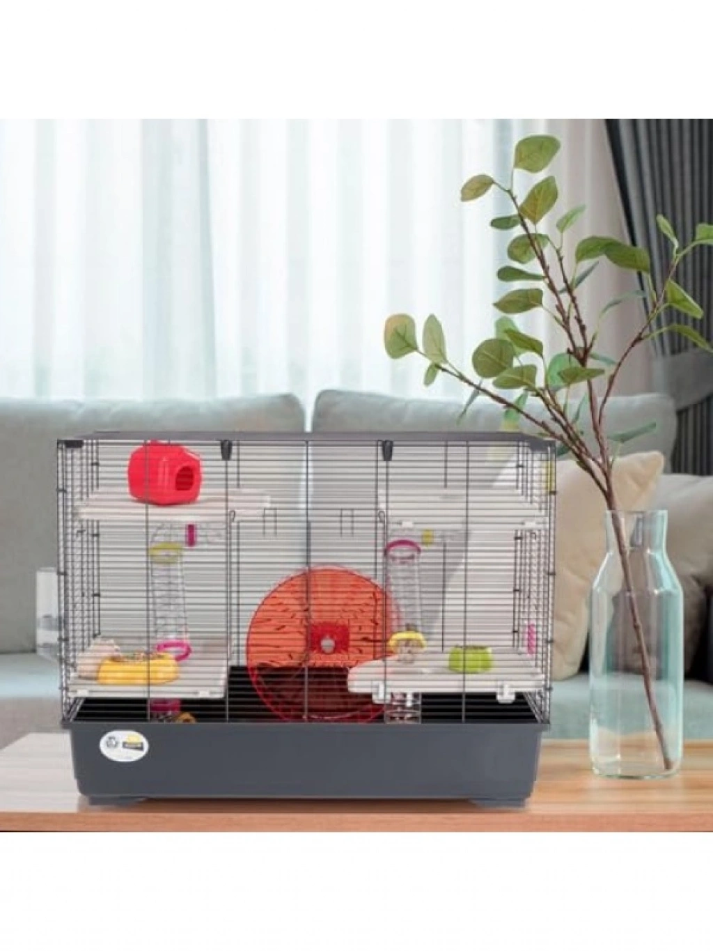 Evcil kemirgenler için geniş ve konforlu bir yaşam alanı sunan bu 5 katlı hamster kafesi, 82 x 51 x 62 cm ölçüleriyle ferah bir ortam sağlar. Şeffaf tünellerle bağlanan katlar, hamsterınızın oyun oynamasına olanak tanır. Dayanıklı boyalı metal ve plastik malzemeden üretilmiştir. Temizliği kolaylaştıran çıkarılabilir tabanı ve güvenlik kancalı kapıları ile pratik bir kullanım sunar. Aksesuarlarla birlikte teslim edilen bu kafes, kemirgen dostlarınız için ideal bir yaşam alanı oluşturur.