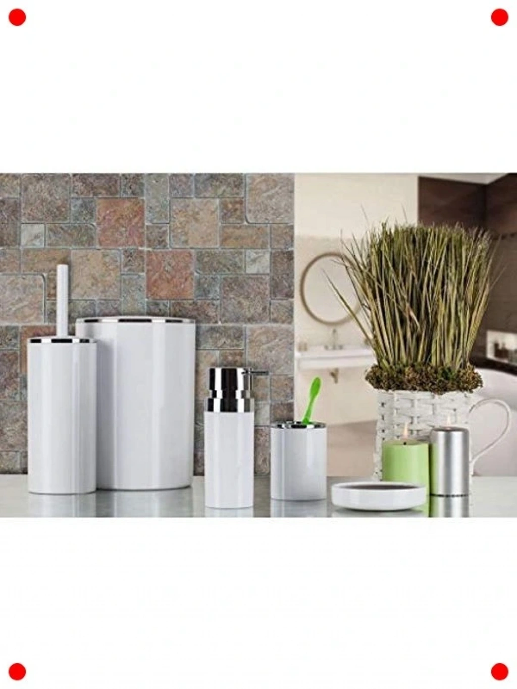 Banyonuza modern ve şık bir dokunuş kcak olan bu 5 parçalı beyaz banyo seti ile düzeni ve estetiği bir araya getirin. Set, sıvı sabunk, katı sabunk, diş fırçalık, çöp kovası ve tuvalet fırçası gibi temel aksesuarları içerir. Beyaz rengi, banyonuzda ferah ve aydınlık bir atmosfer yaratırken, nimalist tasarımıyla her türlü dekorasyona kolayca uyum sağlar. Yüksek kaliteli malzemeden üretilş op, neme ve suya karşı dayanıklıdır. Banyonuzda hem işlevsel bir çözüm sunar hem de bütüncül bir görünüm sağlayarak kişisel bakım alanınızı zenginleştirir.