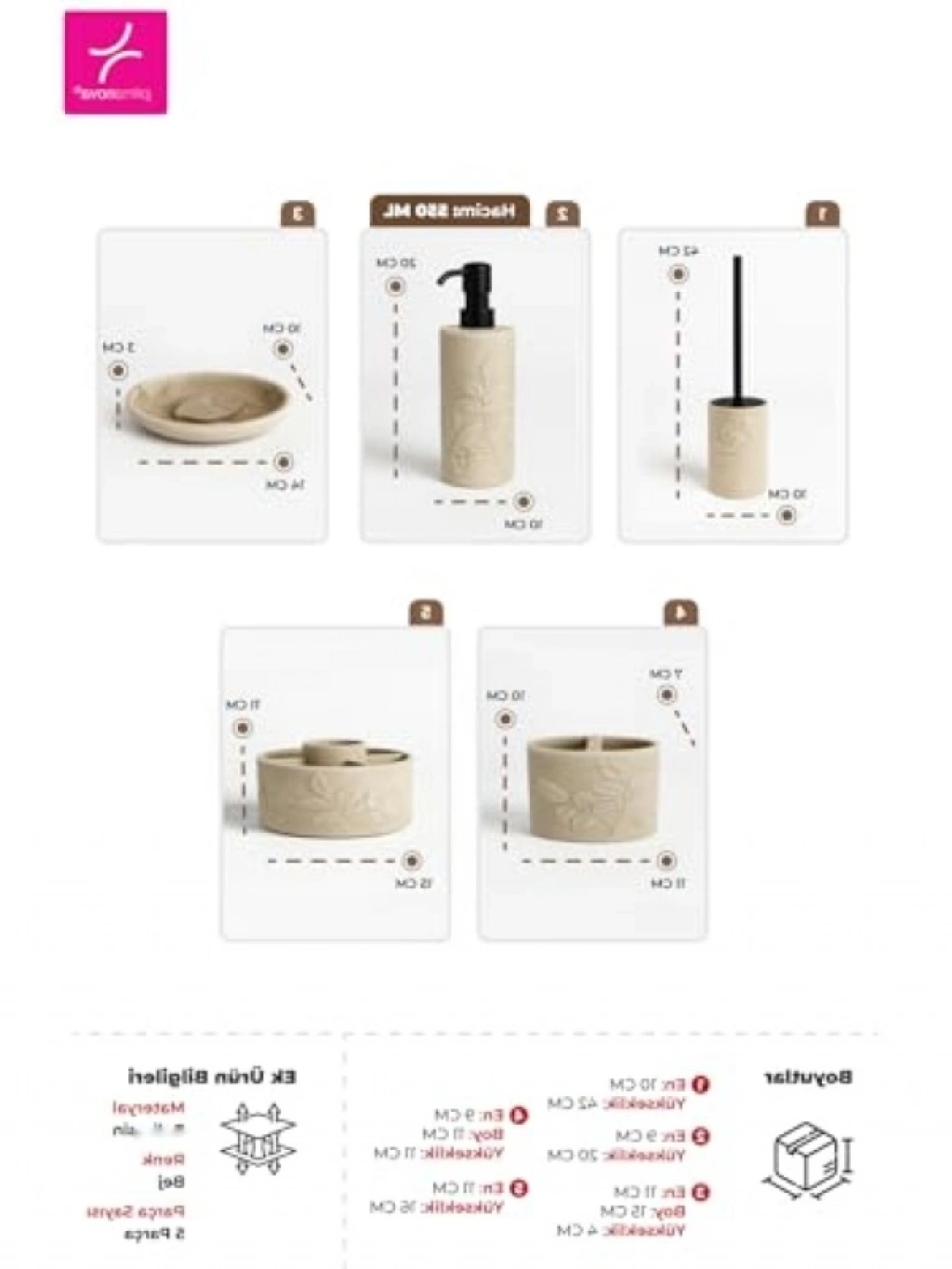 Bu banyo seti, modern tasarımı ile banyonuza estetik bir dokunuş katıyor. 5 parçadan oluşan set, poliresin malzemeden üretilmiştir ve uzun ömürlüdür. Şık tonlarıyla banyonuzu daha ferah ve şık hale getirir. Kullanım kolaylığı sağlayan bu ürün, banyonuzda düzeni sağlamak için idealdir. Hem fonksiyonel hem de dekoratif bir seçenek arayanlar için mükemmel bir tercihtir.
