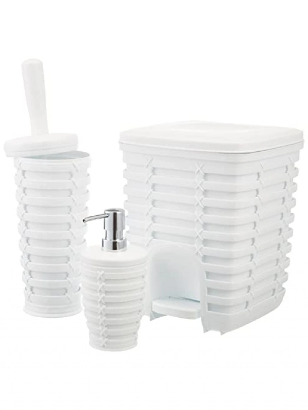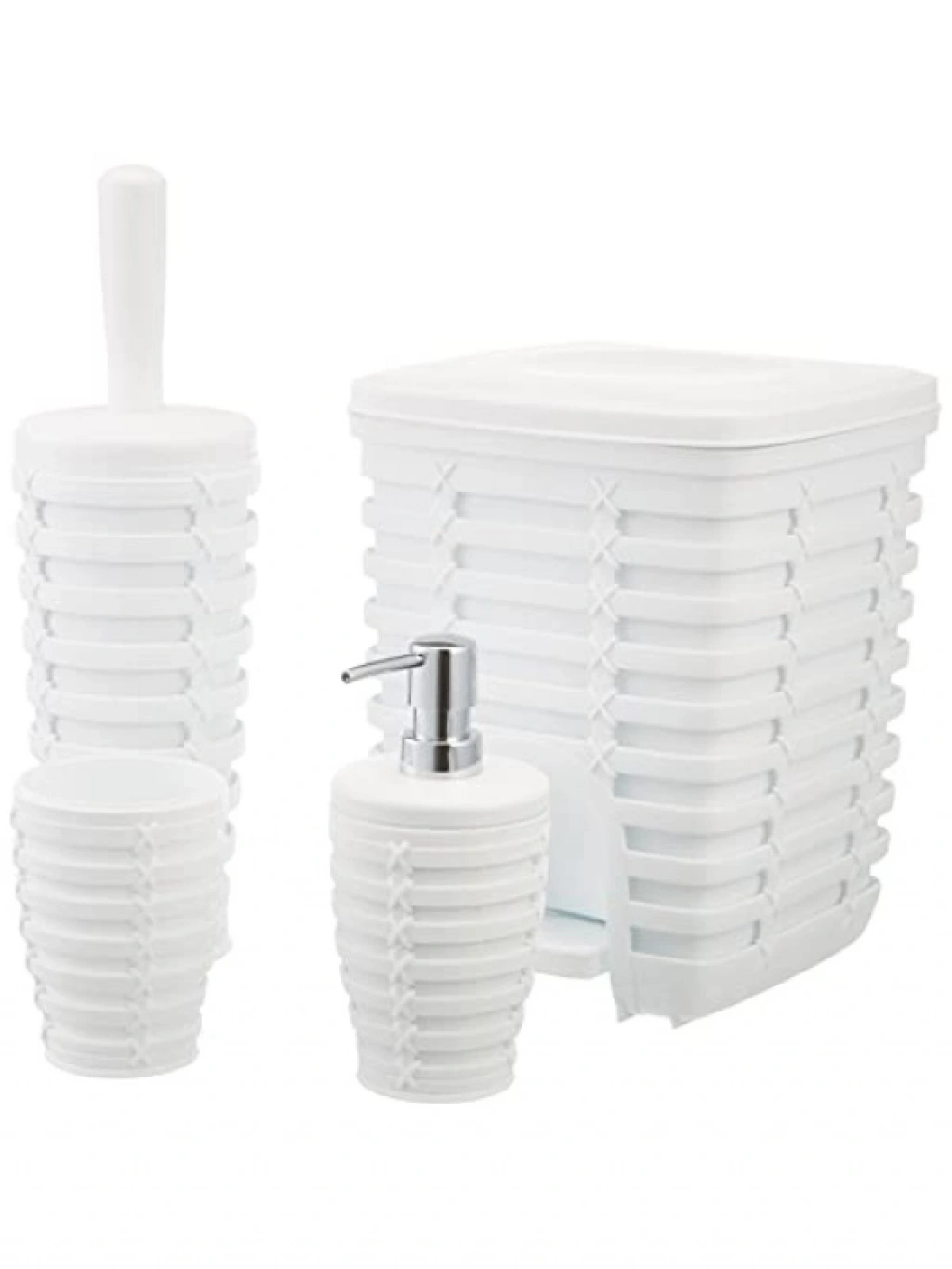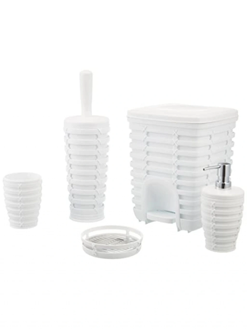 Bu banyo seti, sıvı sabunluk, sabunluk, diş fırçalık, çöp kovası ve tuvalet fırçası olmak üzere toplamda 5 parçadan oluşmaktadır. Modern beyaz tasarımı ile her banyo dekorasyonuna uyum sağlar. Kaliteli malzemeden üretilmiş olan bu set, hijyenik kullanım ve kolay temizlik imkanı sunar. Banyonuzda düzen ve şıklığı bir arada sağlamak için ideal bir tercihtir.