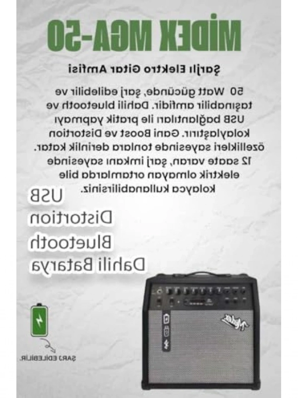 Bu güçlü gitar amfisi, 50 watt çıkış gücüne sahiptir ve Bluetooth ile USB bağlantı seçenekleri sunar. 4 girişli yapısıyla birden fazla enstrümanı destekler. Taşınabilir tasarımı ile her yere götürebilir ve müzikal deneyiminizi zenginleştirebilirsiniz.