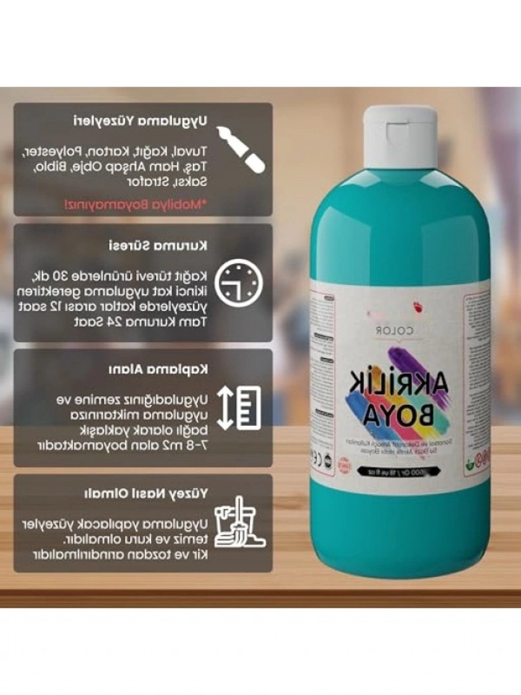 Yüksek kaliteli 500gr turkuaz akrilik boya, sanat projelerinizde mükemmel bir seçimdir. Hızla kuruyan yapısı, çeşitli yüzeylerde kolayca uygulanabilir. Su bazlı formülü sayesinde temizliği kolaydır ve sağlığa zararlı maddeler içermez. Yaratıcılığınızı ortaya çıkarmak için ideal bir boyadır.