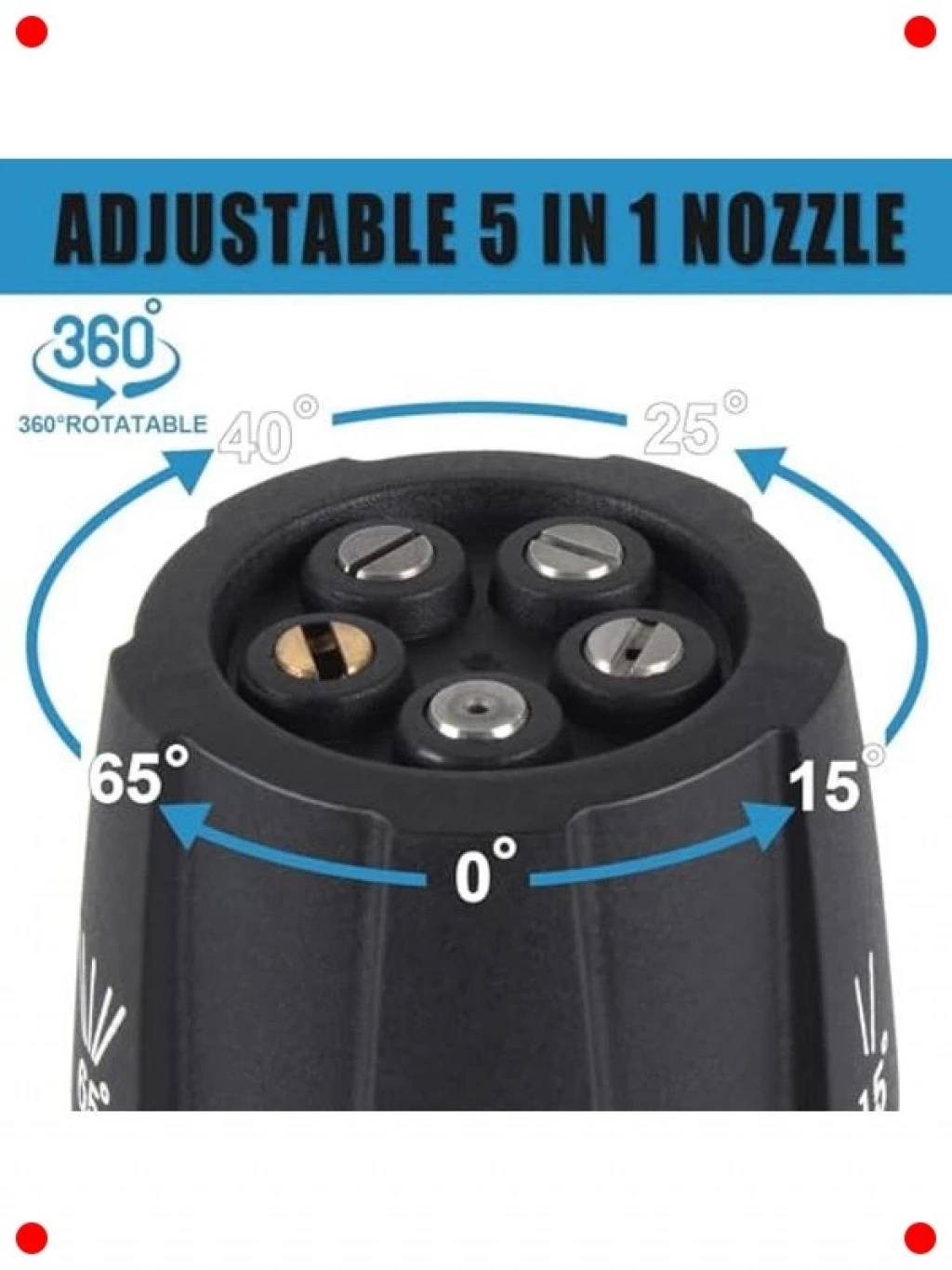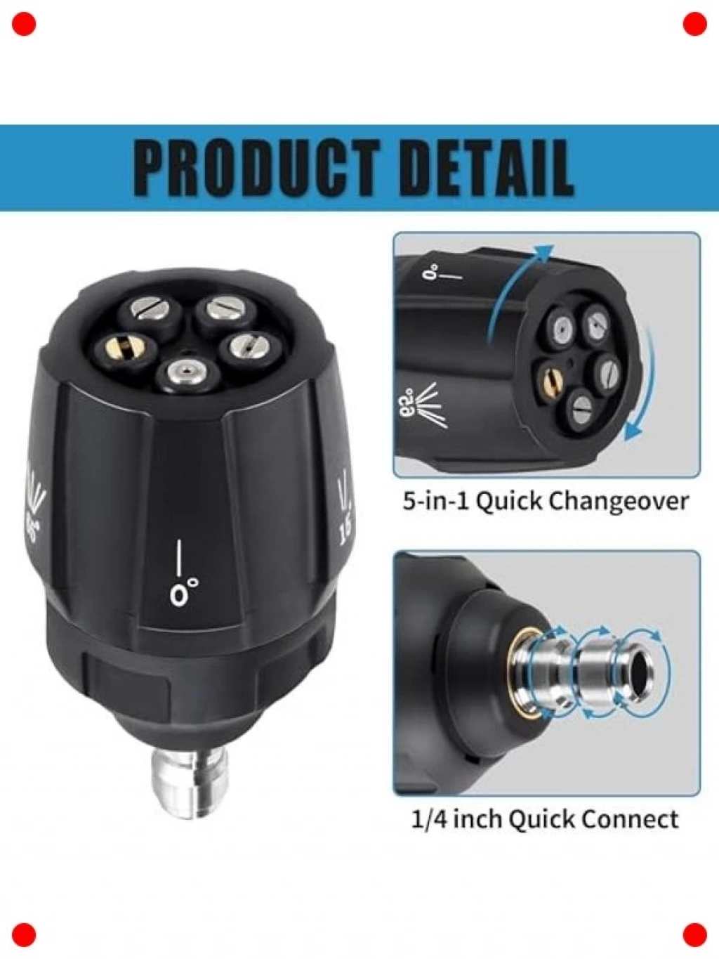 Basınçlı yıkama makinenizin performansını artıran bu 5'i 1 arada hızlı değişim nozulu ile temizlik işlerinizi kolaylaştırın. Tek bir başlıkta beş farklı püskürtme açısını (0°, 15°, 25°, 40°, sabun) birleştirerek her türlü temizlik ihtiyacınıza pratik çözümler sunar. İster inatçı kirleri çıkarmak için güçlü bir jet, ister hassas yüzeyler için geniş bir püskürtme, ister sabun uygulaması olsun; bu nozul saniyeler içinde ayarlanabilir. 1/4 inç hızlı bağlantı özelliği sayesinde kolayca takılıp çıkarılabilir. Yüksek kaliteli malzemeden üretilmiştir, dayanıklı ve uzun ömürlüdür. Zamandan tasarruf edin ve temizlik işlerinizde maksimum verimlilik elde edin.