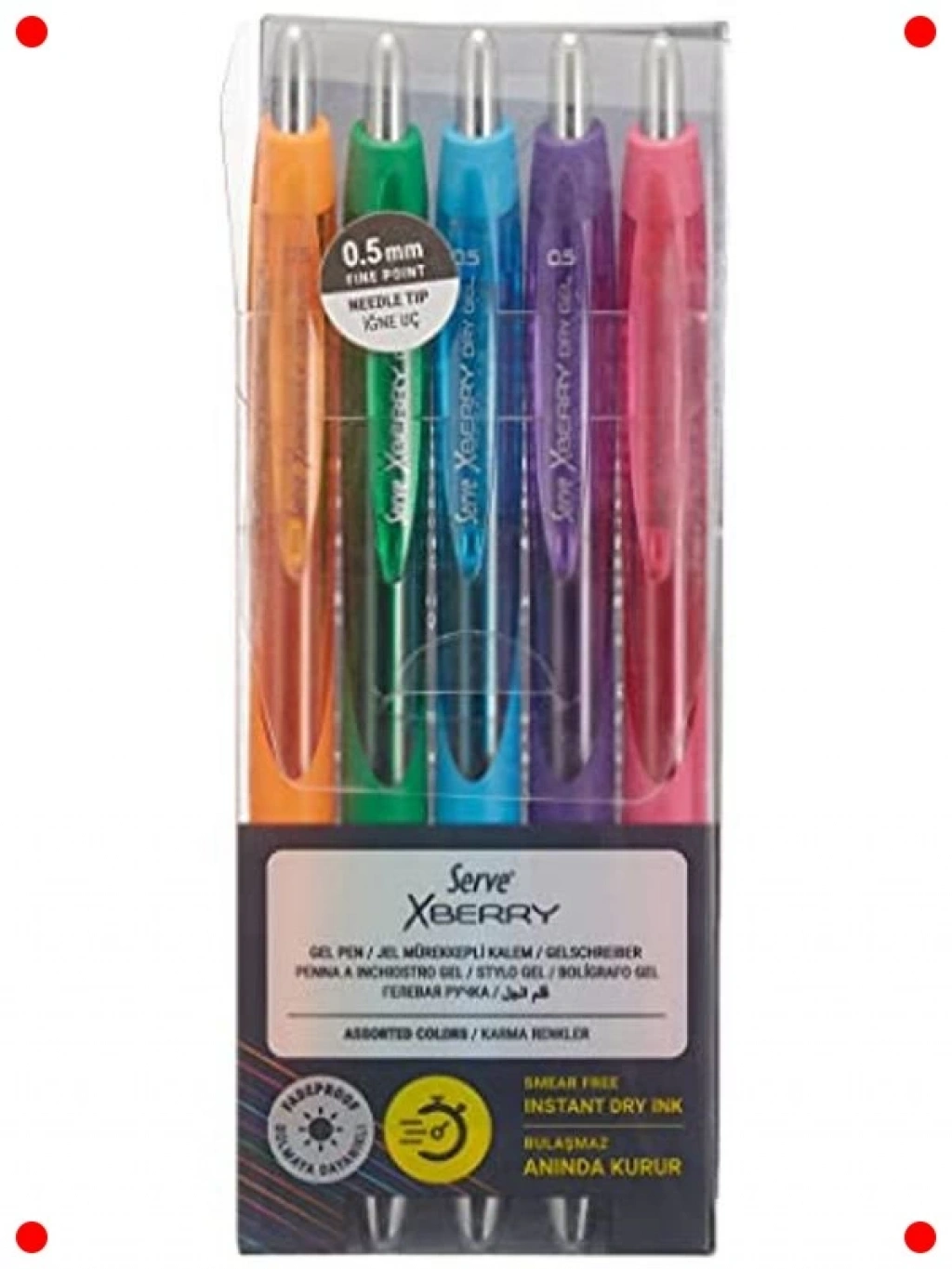 Pürüzsüz ve keskin yazım deneyimi arayanlar için tasarlanmış bu 5'li jel kalem seti ile notlarınızı ve yazılarınızı güzelleştirin. 0.5 mm iğne ucu, son derece ince ve hassas çizgiler çekmenizi sağlayarak, küçük alanlara bile net bir şekilde yazma olanağı sunar. Akıcı jel mürekkebi, kağıt üzerinde kolayca kayar ve canlı, koyu renkler bırakır, böylece yazdıklarınız daha belirgin olur. Hızlı kuruma özelliği, mürekkebin dağılmasını veya leke yapmasını önleyerek temiz bir çalışma alanı sağlar. Okulda, ofiste veya günlük kullanımda, detaylı notlar almak ve hassas çizimler yapmak için idealdir.