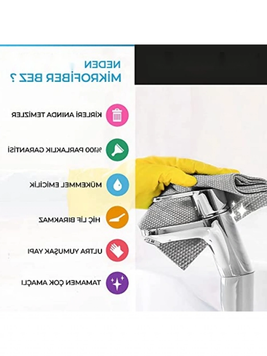 5 adet mikrofiber temizlik bezi içeren bu paket, 60x40 cm boyutları ile çok amaçlı kullanım için idealdir. %80 polyester ve %20 polyamid karışımından üretilen bu bezler, toz ve kirleri kolayca çıkarır. Tüy bırakmayan yapısı sayesinde, yüzeyleri çizmez ve kimyasal temizleyici kullanma ihtiyacını azaltır. Cam, ayna, mutfak dolapları gibi çeşitli yüzeylerde kullanabileceğiniz bu bezler, mükemmel emicilik ve yumuşaklık özellikleri ile dikkat çeker. Uzun süreli dayanıklılık sunar ve tekrar tekrar yıkanabilir.