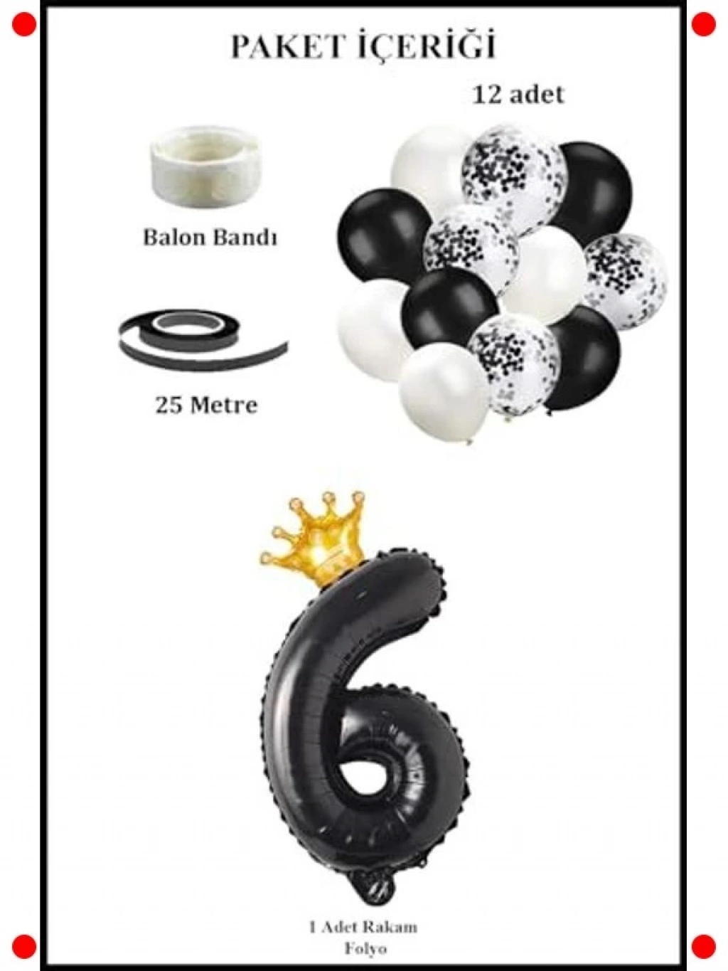 6. yaş kutlamalarınızı unutulmaz kılacak bu özel balon ve parti seti ile partinize şıklık katın! Büyük ve göz alıcı 6 rakamlı siyah folyo balon, partinizin odak noktası olacak. Set içerisinde yer alan kral tacı şeklindeki balon ve konfetili siyah balonlar, kutlamalarınıza zengin ve zarif bir atmosfer katacak. Kolayca şişirilebilir ve uzun süre havada kalabilir. Doğum günü partileri, yıl dönümleri ve özel etkinlikler için mükemmel bir dekorasyon seçeneğidir. Misafirlerinizi etkileyecek ve fotoğraflarınıza harika bir arka plan oluşturacak bu set ile kutlamanız şık ve eğlenceli geçecek.