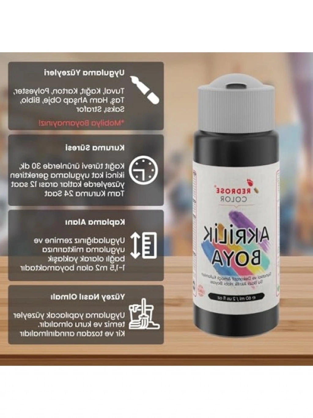 Yaratıcı projeleriniz için mükemmel bir seçenek olan 60ml siyah akrilik boya, zengin pigmentleri ile canlı ve derin renkler sunar. Hızla kuruyan yapısı sayesinde, sanat çalışmalarınızı hızlı bir şekilde tamamlamanızı sağlar. Su bazlı formülü ile kolayca temizlenebilir ve çeşitli yüzeylerde kullanılabilir; tuval, ahşap, taş veya kağıt gibi. Sanat yeteneklerinizi geliştirmek ve kişisel projelerinizi hayata geçirmek için ideal bir üründür.