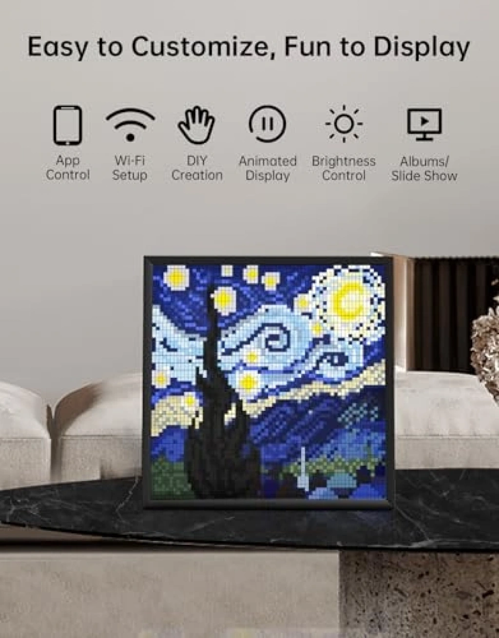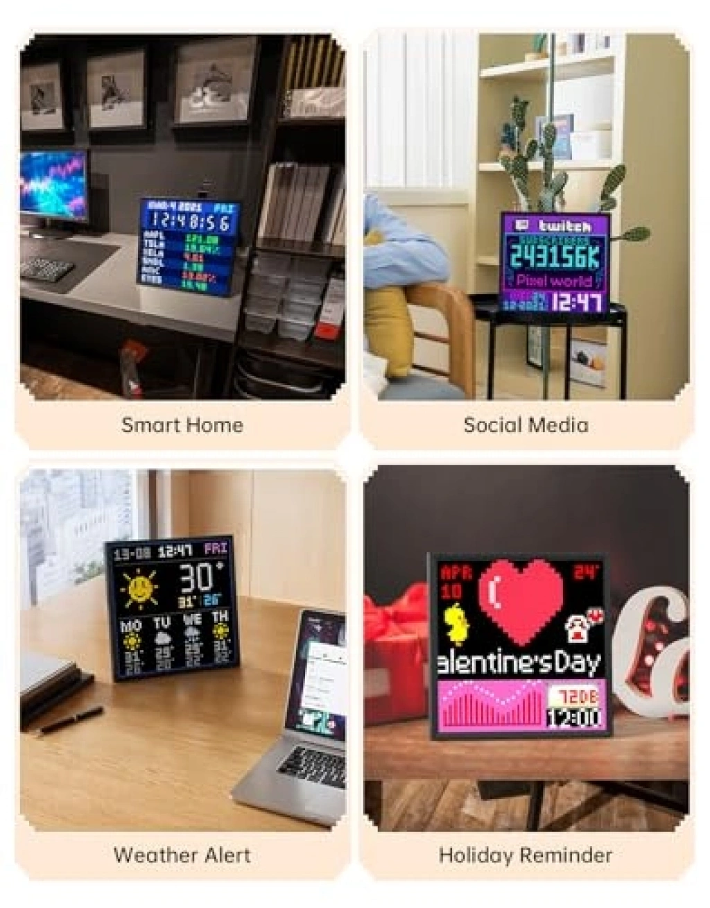 64x64 LED panel, WiFi bağlantısıyla çalışan bir piksel sanat ekranıdır. Mobil uygulama sayesinde istediğiniz piksel sanatını animasyona dönüştürebilir ve özelleştirebilirsiniz. Ürün, çevrimiçi bilgi sayacını ayarlayarak çeşitli verileri otomatik olarak görüntüleme yeteneğine sahiptir. Divoom uygulaması ile piksel sanatı tasarımı oldukça kolaydır ve eğlenceli bir deneyim sunar.