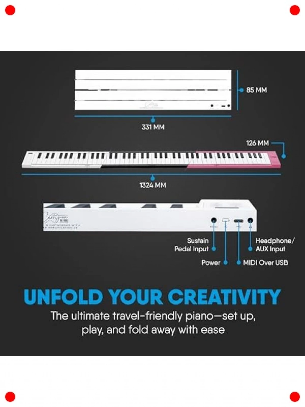 Bu 88 tuşlu katlanır dijital piyano, müzisyenlere hareket halindeyken bile tam bir piyano deneyimi sunar. Tam boyutlu, dokunmaya duyarlı tuşları sayesinde gerçek bir piyano hissi verirken, yenilikçi katlanabilir tasarımıyla kolayca taşınabilir ve saklanabilir. Dahili şarj edilebilir pili sayesinde priz aramaya gerek kalmadan uzun süre çalabilirsiniz. USB MIDI bağlantı özelliği, piyanonuzu bir MIDI denetleyici olarak kullanarak dijital müzik üretim yazılımlarınızla entegre etmenize olanak tanır. Kulaklık çıkışı ile sessizce pratik yapabilir, dahili hoparlörleri sayesinde ise anında performans sergileyebilirsiniz. Seyahat eden müzisyenler ve yer sıkıntısı olanlar için mükemmel bir çözümdür.