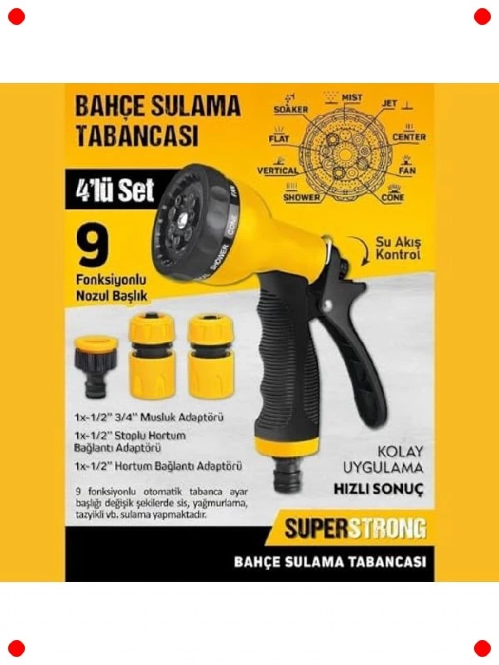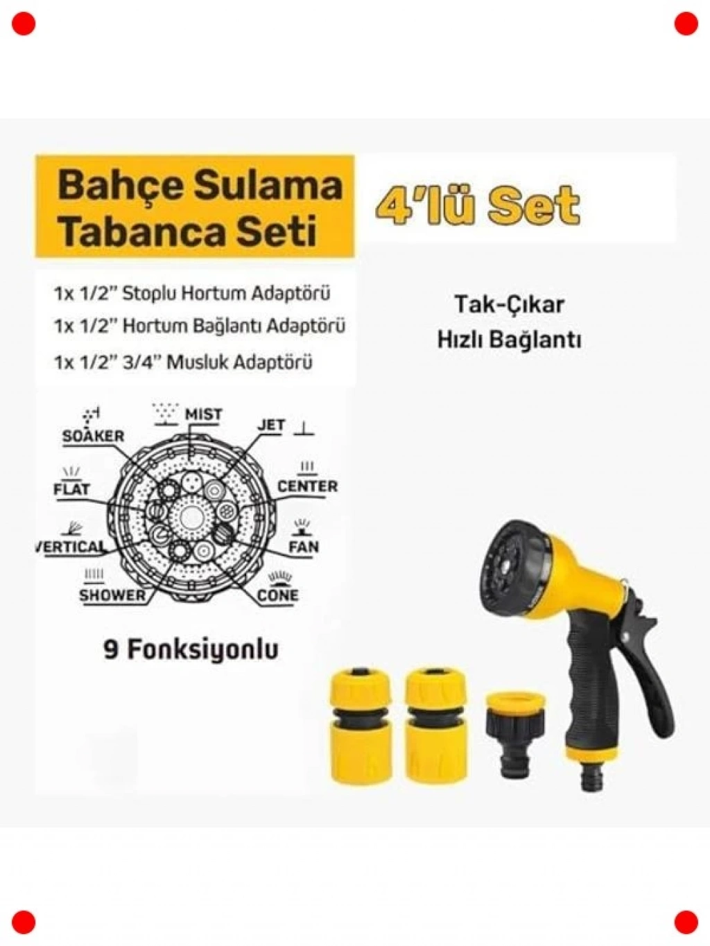 Bahçe sulama, araç yıkama ve dış mekan temizliği için çok yönlü bir çözüm sunan bu 4 parçalı sulama tabancası seti, işlerinizi kolaylaştırmak üzere tasarlandı. 9 farklı püskürtme fonksiyonu sayesinde narin bitkilerinizi sulamaktan inatçı kirleri temizlemeye kadar her türlü ihtiyaca cevap verir. Dayanıklı yapısı ve ergonomik tasarımı, uzun süreli kullanımlarda bile rahat bir tutuş sağlar. Tak-çıkar hızlı bağlantı özelliği ile hortumunuza saniyeler içinde bağlanabilir ve su akışını anında ayarlayabilirsiniz. Pratikliği ve kullanım kolaylığı ile tüm dış mekan işlerinizde vazgeçilmeziniz olacak.