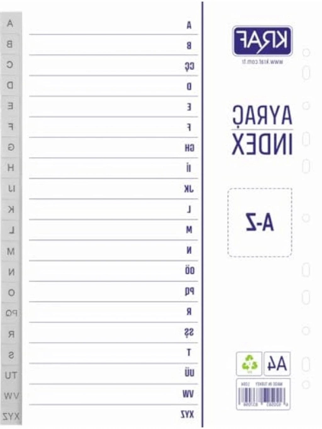 A-Z separator, belgelerinizi düzenli bir şekilde saklamak için mükemmel bir üründür. Harfler ile indekslenmiş yapısı sayesinde aradığınız belgelere hızlıca ulaşmanızı sağlar. Dayanıklı malzemeden üretilmiş olup, uzun süreli kullanım için idealdir. Ofis ortamında veya evde kullanıma uygun bir organizasyon aracıdır.