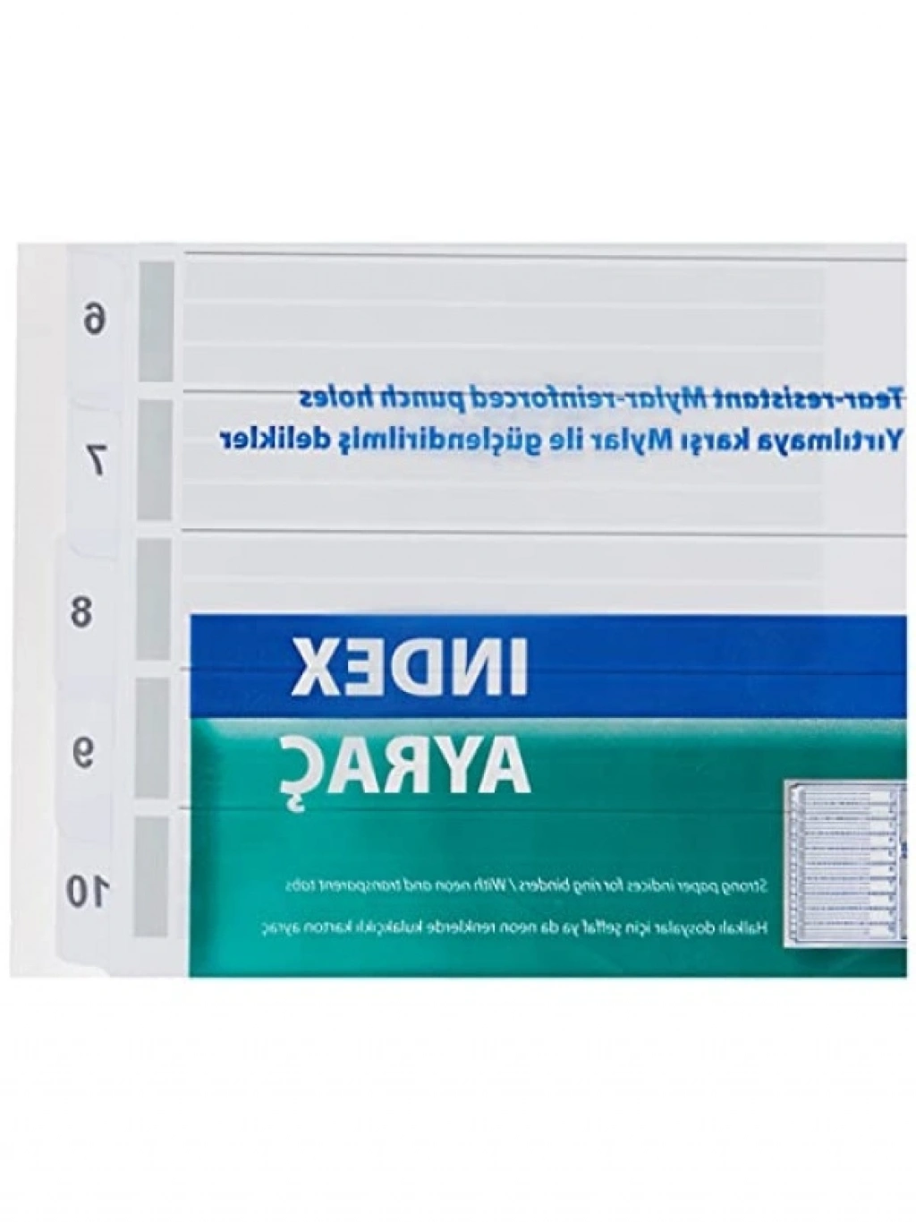 Bu A4 boyutundaki karton ayraç, 1-10 rakamları ile işaretlenmiştir ve belgelerinizi düzenlemenize yardımcı olur. Türkiye menşeli yüksek kaliteli 180 mg/m2 karton malzeme ile üretilmiştir. Mylar ile güçlendirilmiş kulakçıkları sayesinde yırtılmalara karşı dayanıklıdır. Ofis, okul veya ev kullanımı için idealdir. Renkli ve şık tasarımıyla dikkat çekerken, işlevselliği ile de kullanıcıların beğenisini kazanır.