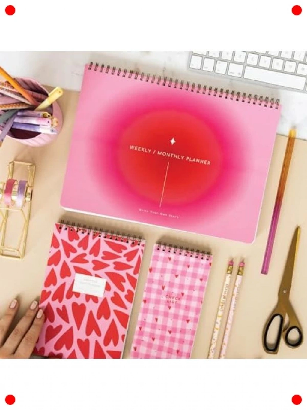 Günlük ve haftalık planlarınızı düzenli bir şekilde organize etmek için tasarlanmış bu A4 boyutunda 3'lü süresiz masaüstü planlayıcı seti, hayatınıza düzen getirecek. Aura/kalp temalı şık tasarımıyla çalışma alanınıza estetik bir dokunuş katarken, tarihsiz yapısı sayesinde istediğiniz zaman kullanmaya başlayabilir ve hiçbir sayfayı boşa harcamazsınız. Haftalık genel bakış ve detaylı günlük bölümler, görevlerinizi, randevularınızı ve hedeflerinizi kolayca takip etmenizi sağlar. Yüksek kaliteli kağıtları, mürekkep akmasını önler ve rahat bir yazım deneyimi sunar. Ofiste, evde veya öğrenciler için ideal olan bu set, zaman yönetiminizi geliştirmenize yardımcı olacak.
