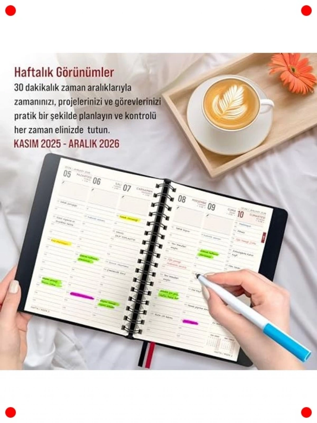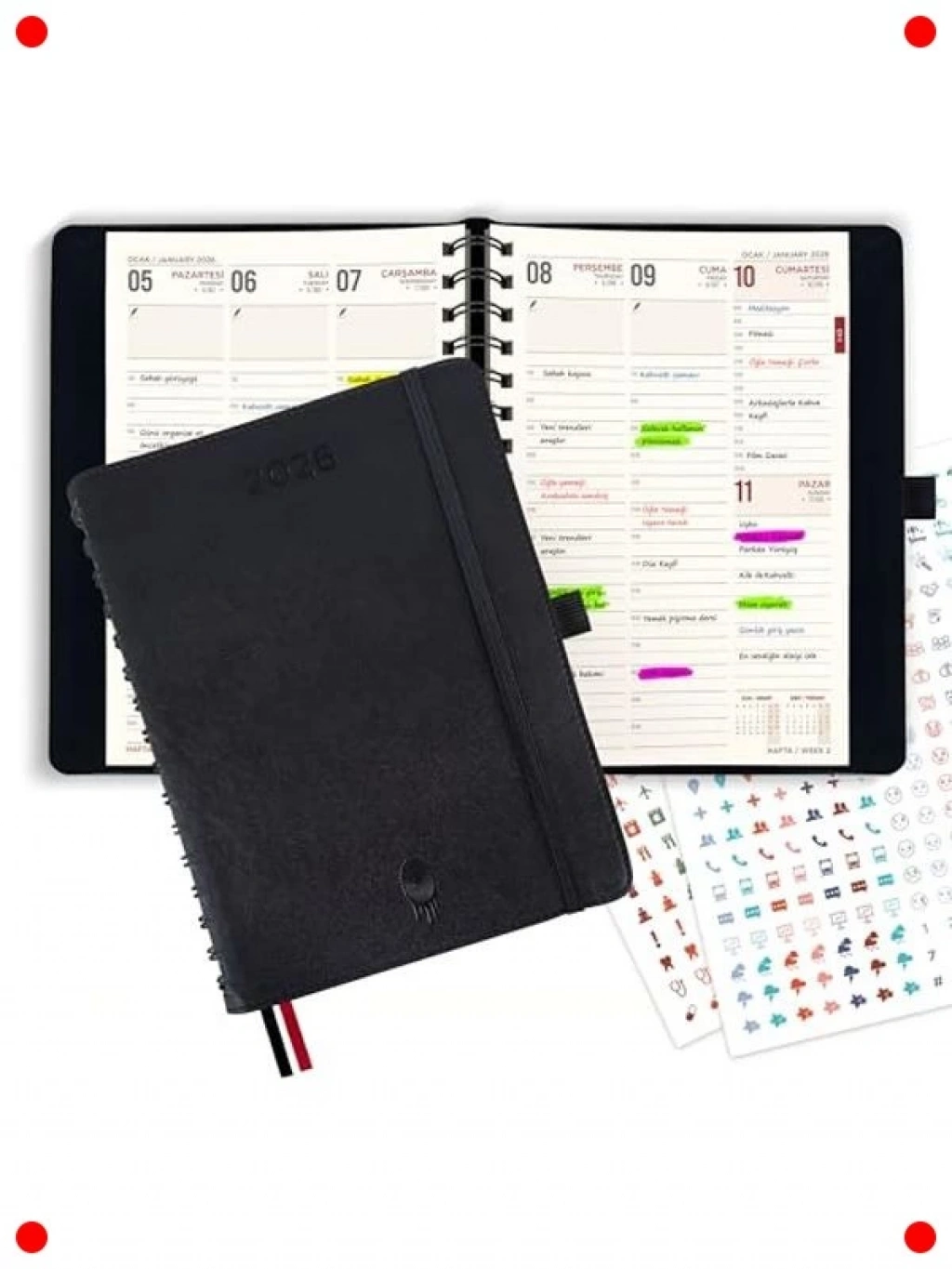 Kasım 2025'ten Aralık 2026'ya kadar 14 aylık detaylı bir planlama deneyimi sunan A5 spiralli ajanda. Haftalık, aylık ve günlük düzenlemeleriyle her türlü programınızı organize etmenize yardımcı olur. 30 dakikalık zaman aralıkları sayesinde randevularınızı ve görevlerinizi hassas bir şekilde planlayabilirsiniz. Dayanıklı suni deri kapağı ve spiral ciltlemesiyle uzun ömürlüdür. Planlarınızı kişiselleştirmek için 2 sayfa çıkartma içerir. Profesyonel ve kişisel kullanıma uygundur.