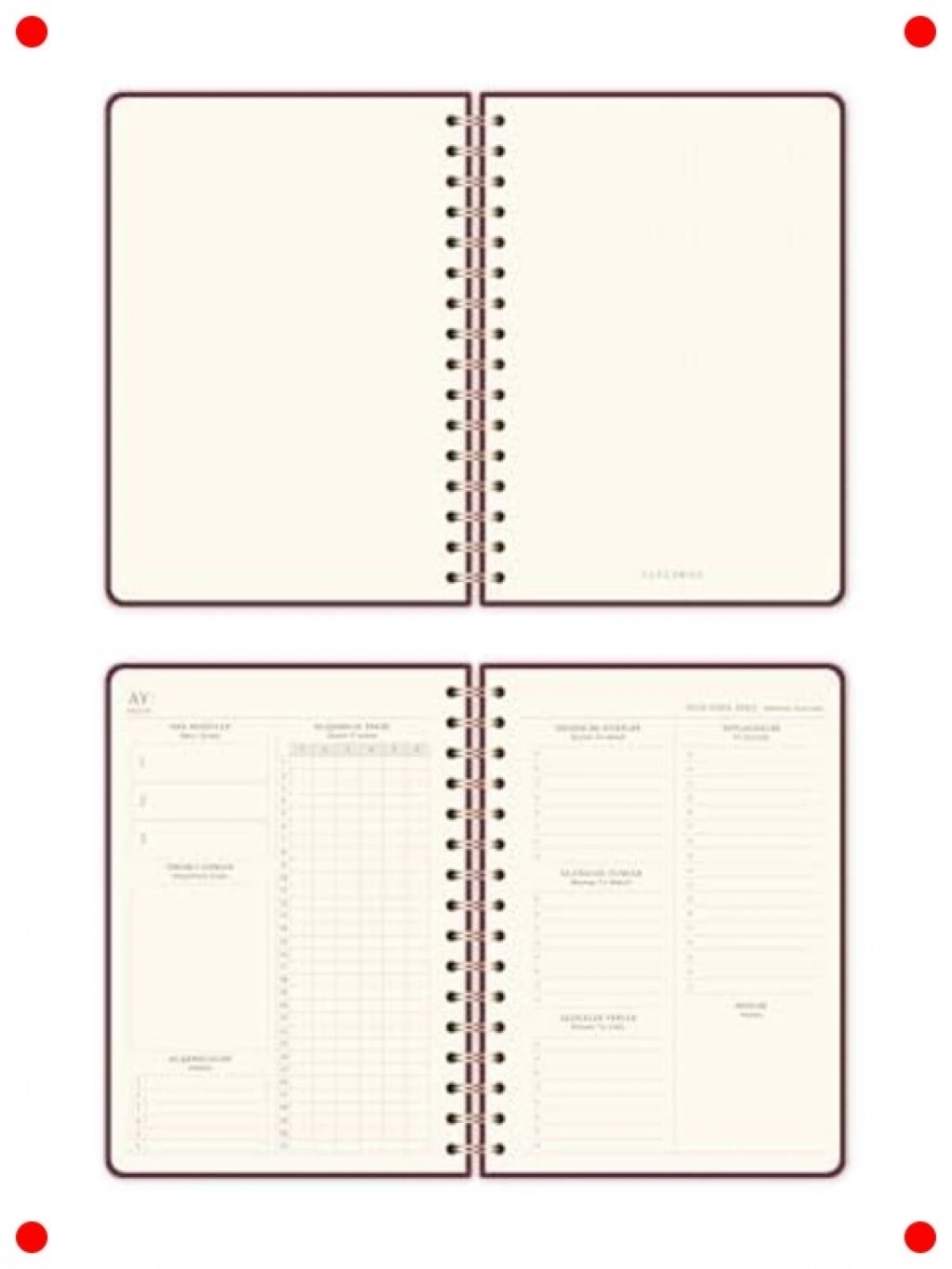 Kişisel planlamanızı tamamen kendi ritminize göre yapın! Bu A5 boyutundaki spiralli süresiz ajanda, tarihsiz sayfaları sayesinde dilediğiniz zaman kullanmaya başlayabilir ve hiçbir sayfayı boşa harcamazsınız. Şık bordo rengindeki keten kapağı, hem dayanıklı hem de estetik bir görünüm sunar. Spiralli tasarımı sayesinde ajandanızı tamamen açabilir, kolayca not alabilir ve sayfalar arasında pratik geçişler yapabilirsiniz. Haftalık ve aylık planlama alanları, görev listeleri ve not sayfaları ile kişisel hedeflerinizi, randevularınızı ve önemli olaylarınızı düzenlemek için idealdir. Hayatınızı organize etmenin en esnek yolu.