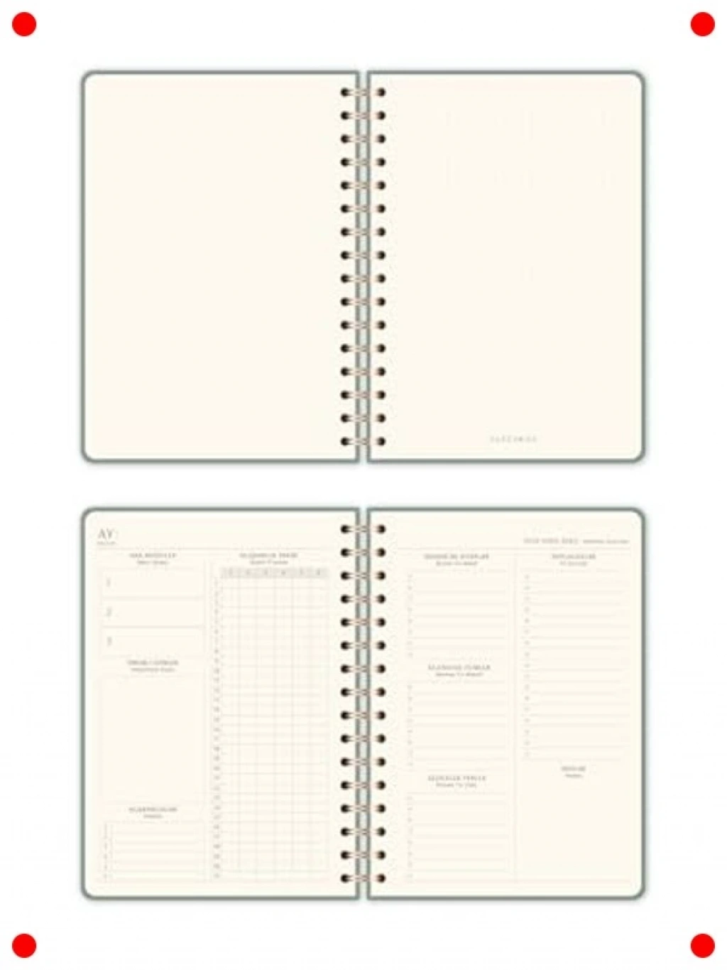 Hedeflerinizi belirlemek, görevlerinizi planlamak ve günlük yaşamınızı düzenlemek için tasarlanmış A5 boyutundaki bu süresiz planlayıcı ajanda ile tanışın. Tarih bağımsız yapısı sayesinde dilediğiniz zaman kullanmaya başlayabilir, hiçbir sayfayı boşa harcamazsınız. Şık keten kapak ve spiral ciltleme, dayanıklılığı ve kullanım kolaylığını bir araya getirir. Doğal yeşil rengi, çalışma alanınıza sakin ve ilham verici bir dokunuş katar. Not almak, randevuları organize etmek, alışkanlıkları takip etmek ve kişisel gelişiminizi desteklemek için mükemmel bir araçtır.