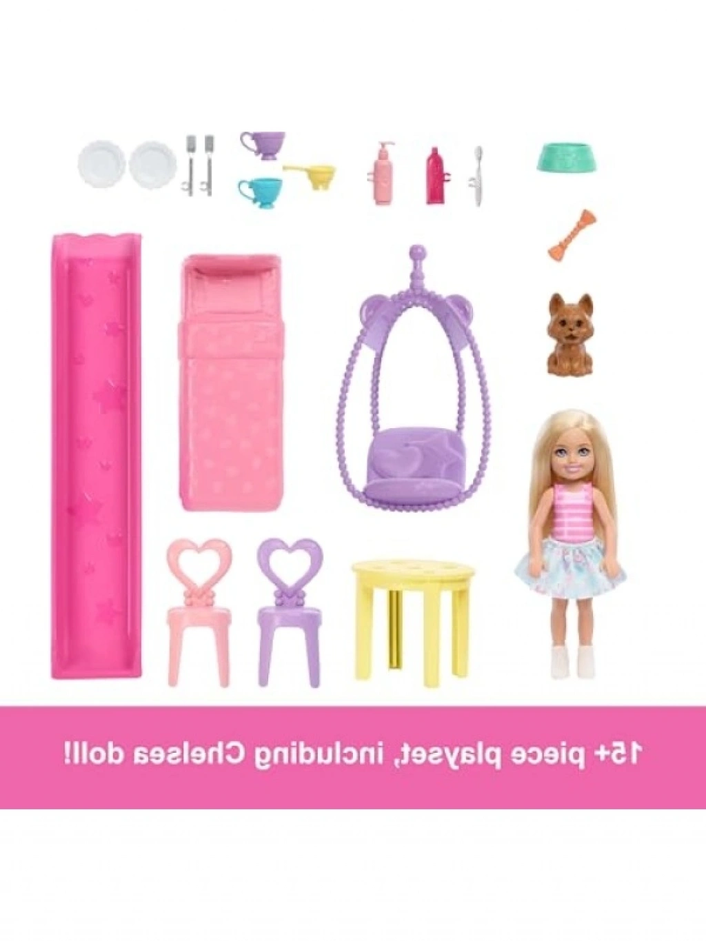 Chelsea'nin minik evi, açıldığında muhteşem bir bebek evine dönüşüyor! 21,5 x 23,5 cm boyutundaki ev, açıldığında 43 x 33 cm boyutuna ulaşıyor. 15'ten fazla aksesuar ile dolu bu oyun seti, Chelsea bebek ve köpekçiği ile eğlenceli anlar sunuyor. Bebek ve köpeği, oturma odasında dinlenebilir, yatak odasında uykuya dalabilir ya da kaydıraktan kayarak eğlenceli vakit geçirebilir. Açılır fırınlı mutfakta yemek pişirme veya banyoda vakit geçirme imkanı da bulunuyor. Bebek evi, yatak, sallanan sandalye ve kalp şeklinde sandalyeleri olan yemek masası gibi eşyalarla birlikte geliyor.