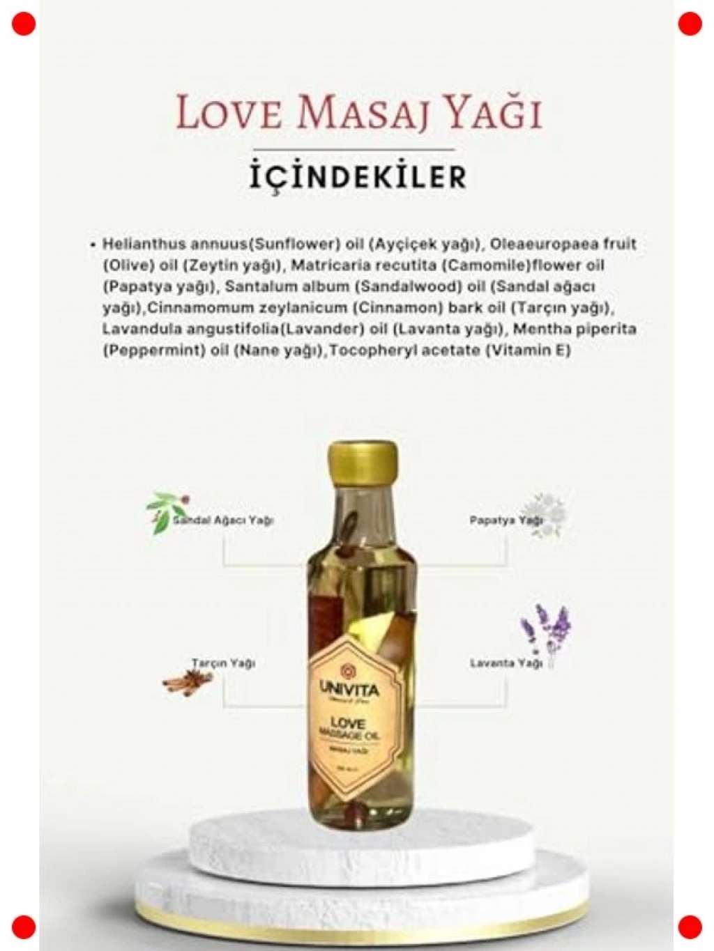 Aşkın ve tutkunun kokularıyla bezeli bu 100 ml'lik afrodizyak aromaterapi masaj yağı ile duyusal bir deneyime dalın. Cildinizi derinlemesine besleyen ve nemlendiren bitkisel içeriği sayesinde ipeksi bir yumuşaklık sunar. Özel olarak seçilmiş esansiyel yağların harmanıyla, hem bedeni hem de zihni rahatlatıcı ve canlandırıcı bir etki yaratır. Romantik anlarınızı taçlandırmak, stresi azaltmak ve partnerinizle bağınızı güçlendirmek için idealdir. Doğal ve hafif formülü ciltte yağlı bir his bırakmazken, hoş kokusuyla unutulmaz anlara zemin hazırlar. Kendinize ve sevdiklerinize özel bir armağan.